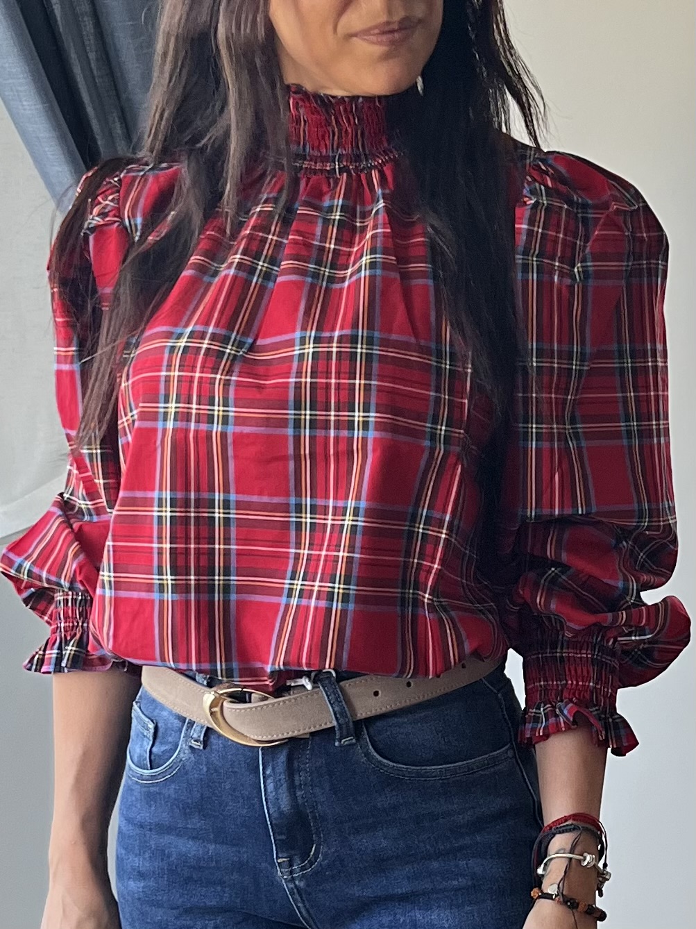 Blusa Escocia cuadros manga larga, cuello engomado subido, magas abullonadas, puños elásticos engomados