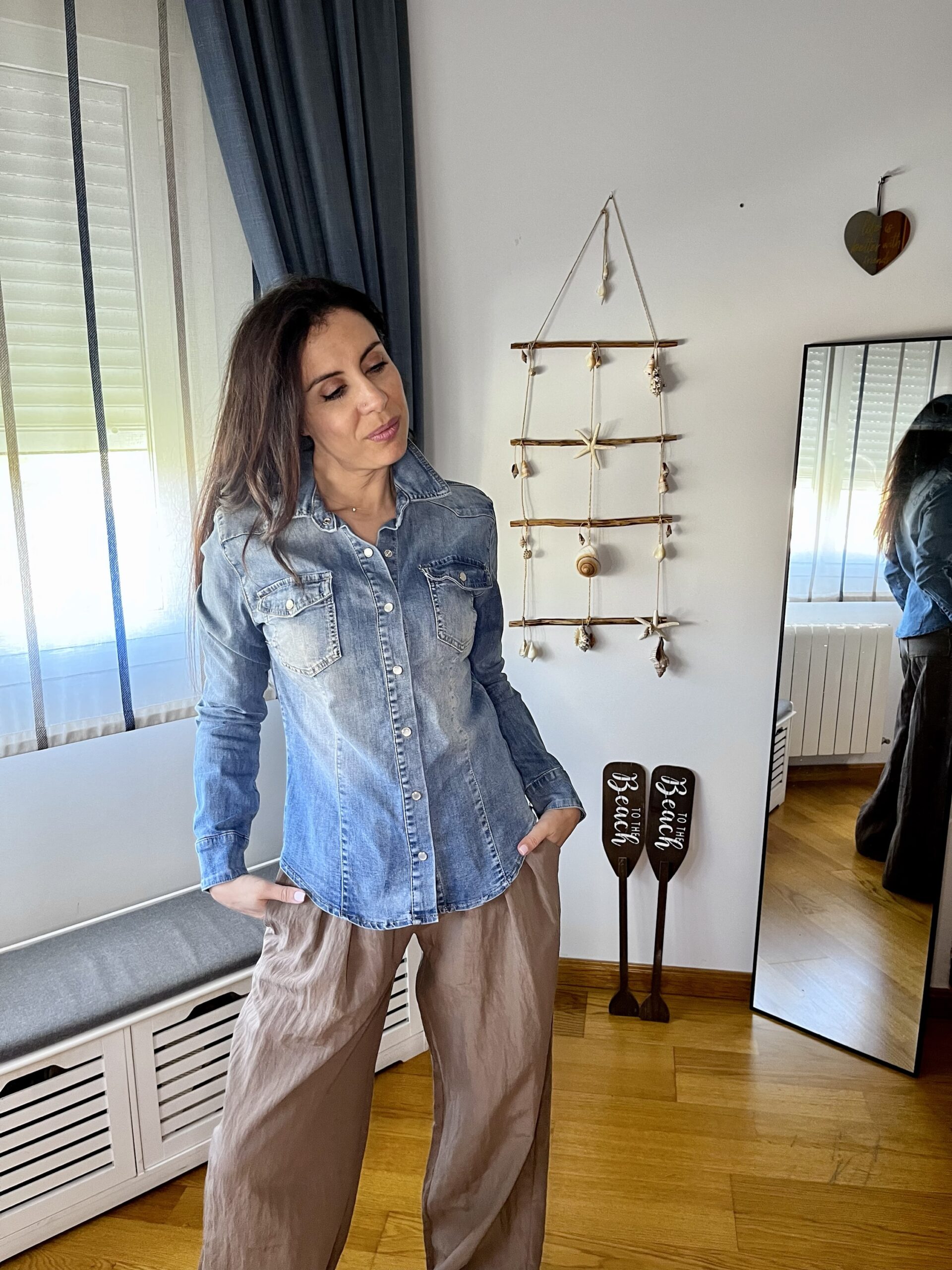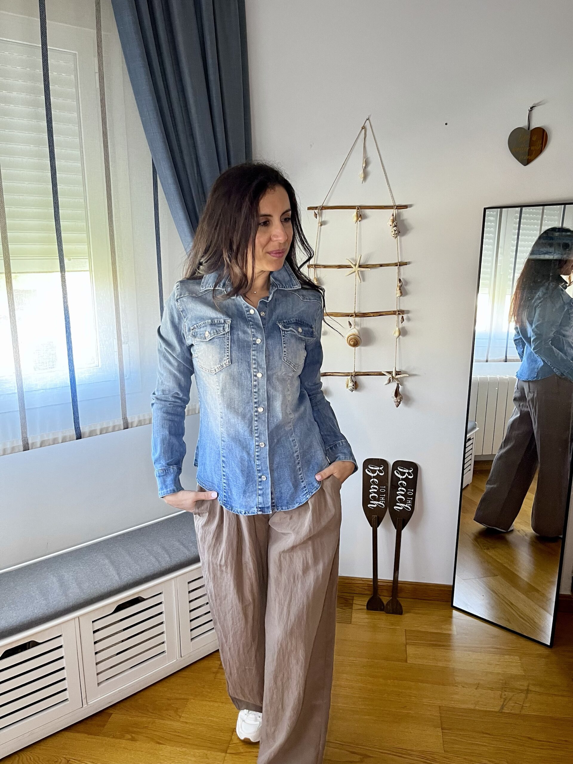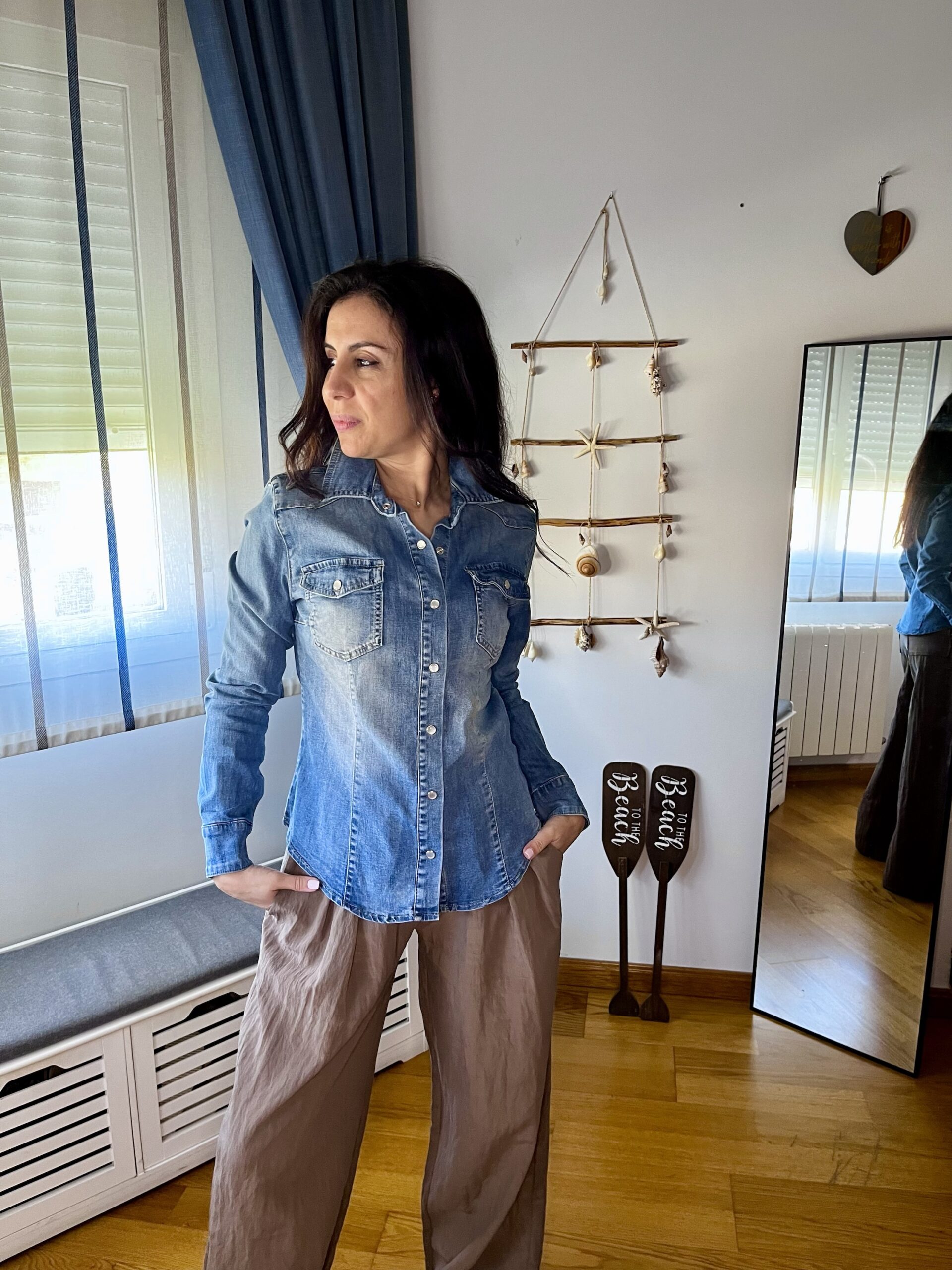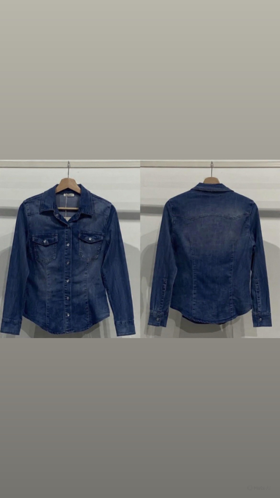 Camisa vaquera con cierre por corchetes en puños y parte delantera, bolsillos frontales, talle ajustado.