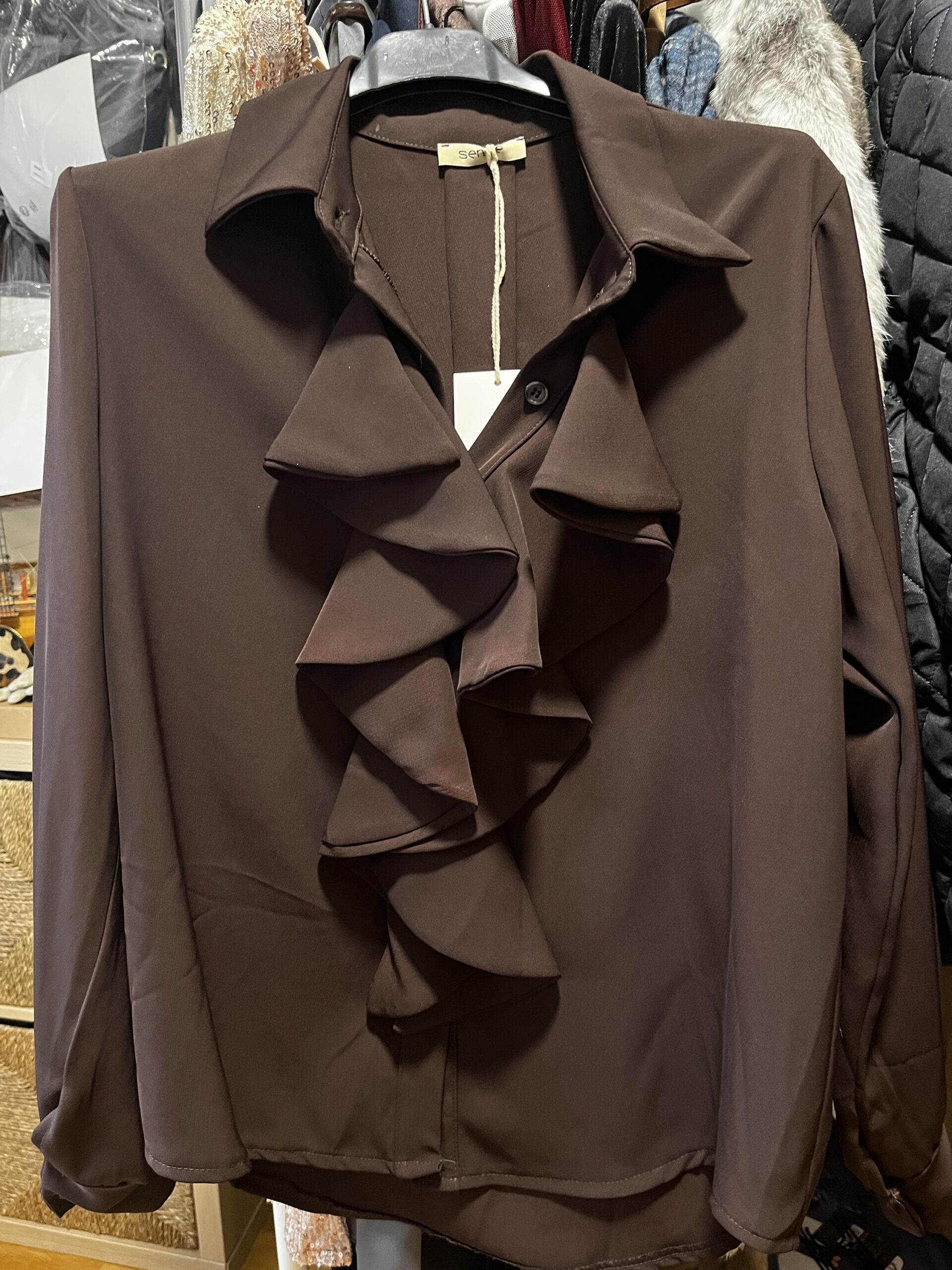 Blusa volantes color chocolate, cierre por botones en parte delantera y puños. Talla única 34/40
