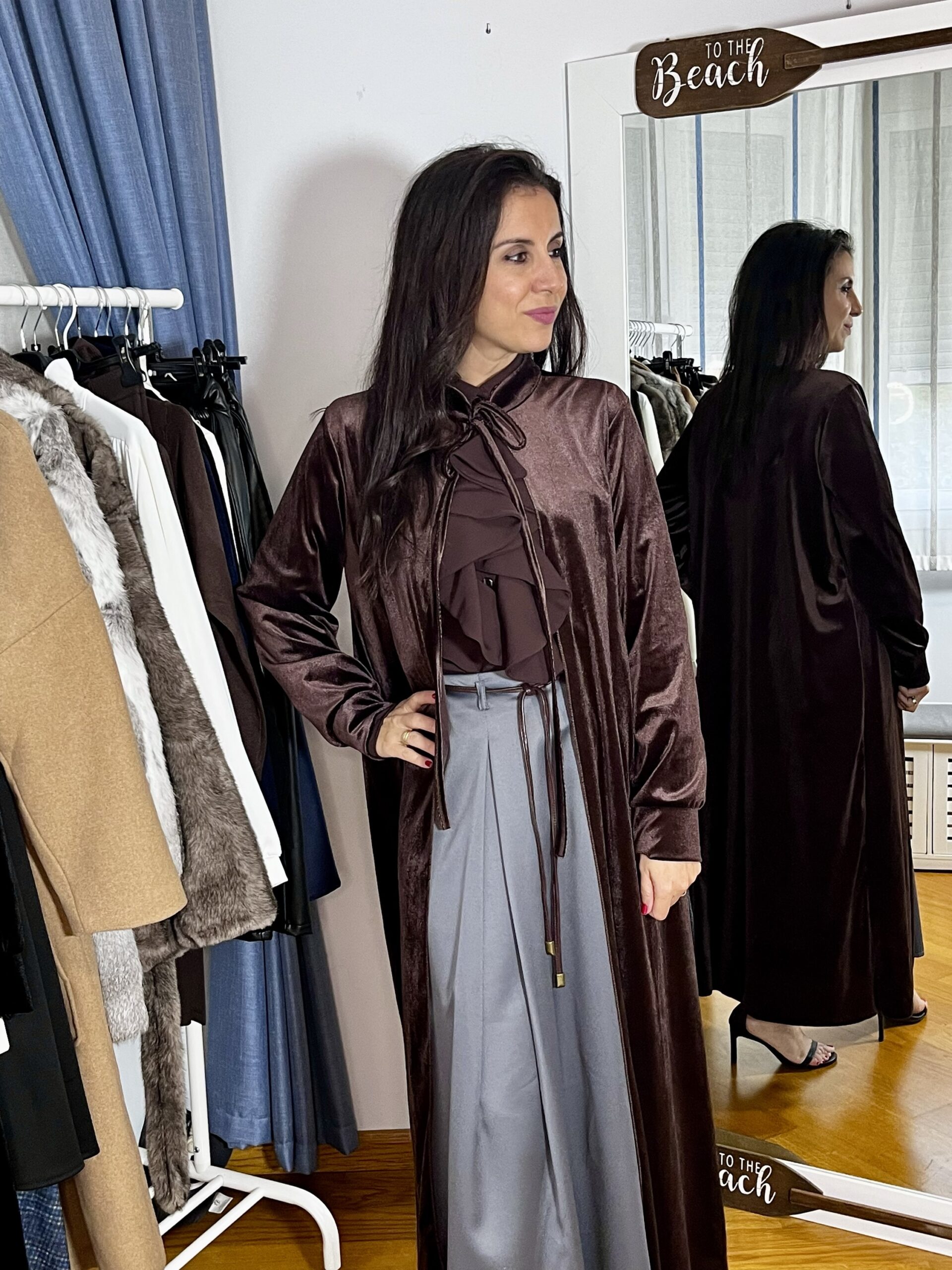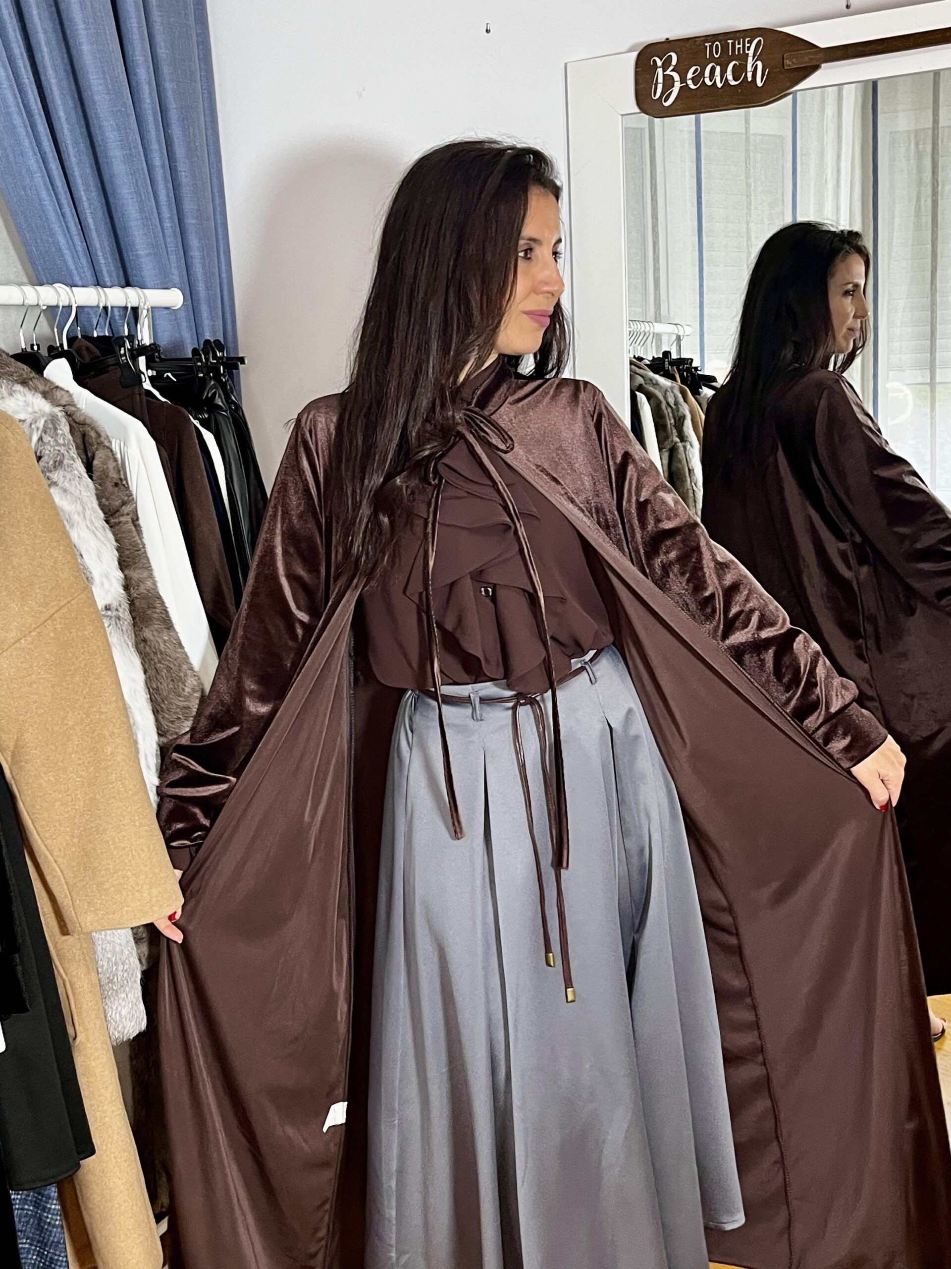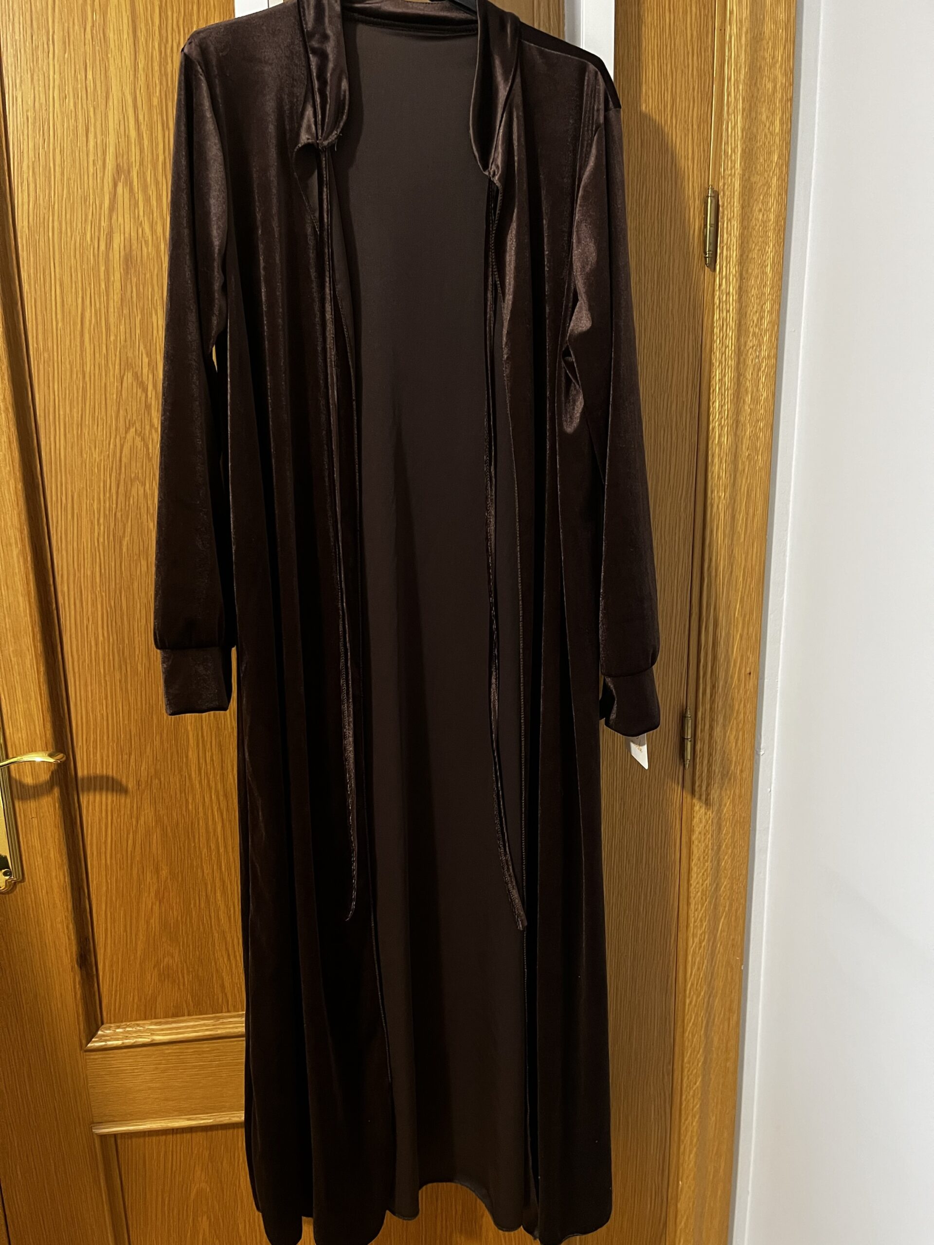 Capa terciopelo marrón chocolate. Cierre por lazo en cuello, botones en puños. Talla única (34/42)