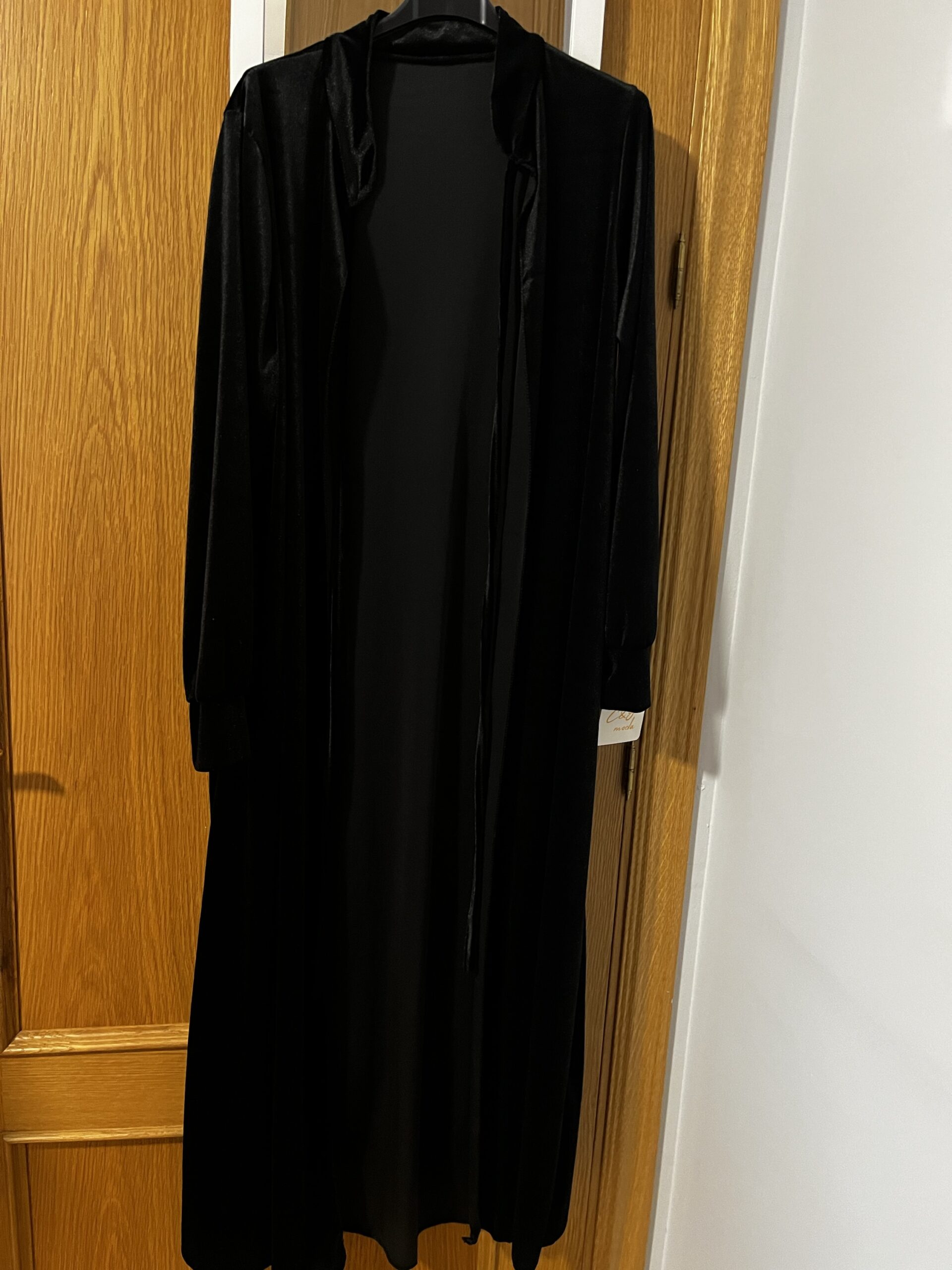 Capa terciopelo negro. Cierre por lazo en cuello, botones en puños. Talla única (34/42)