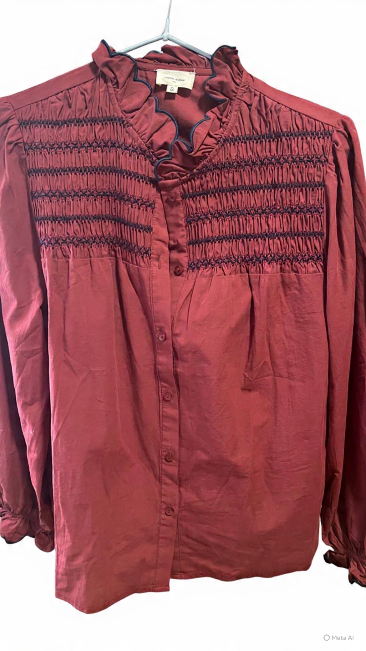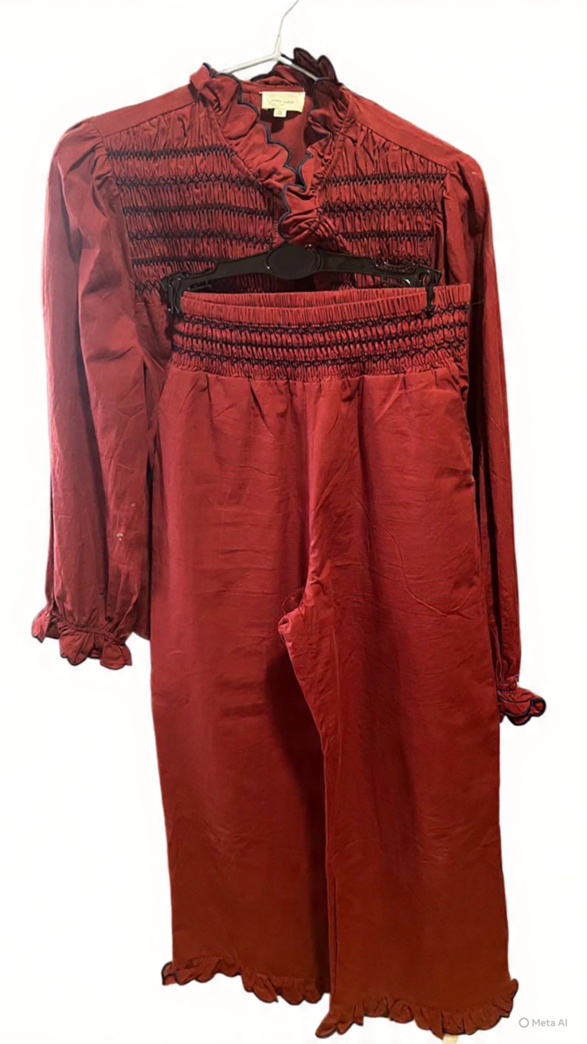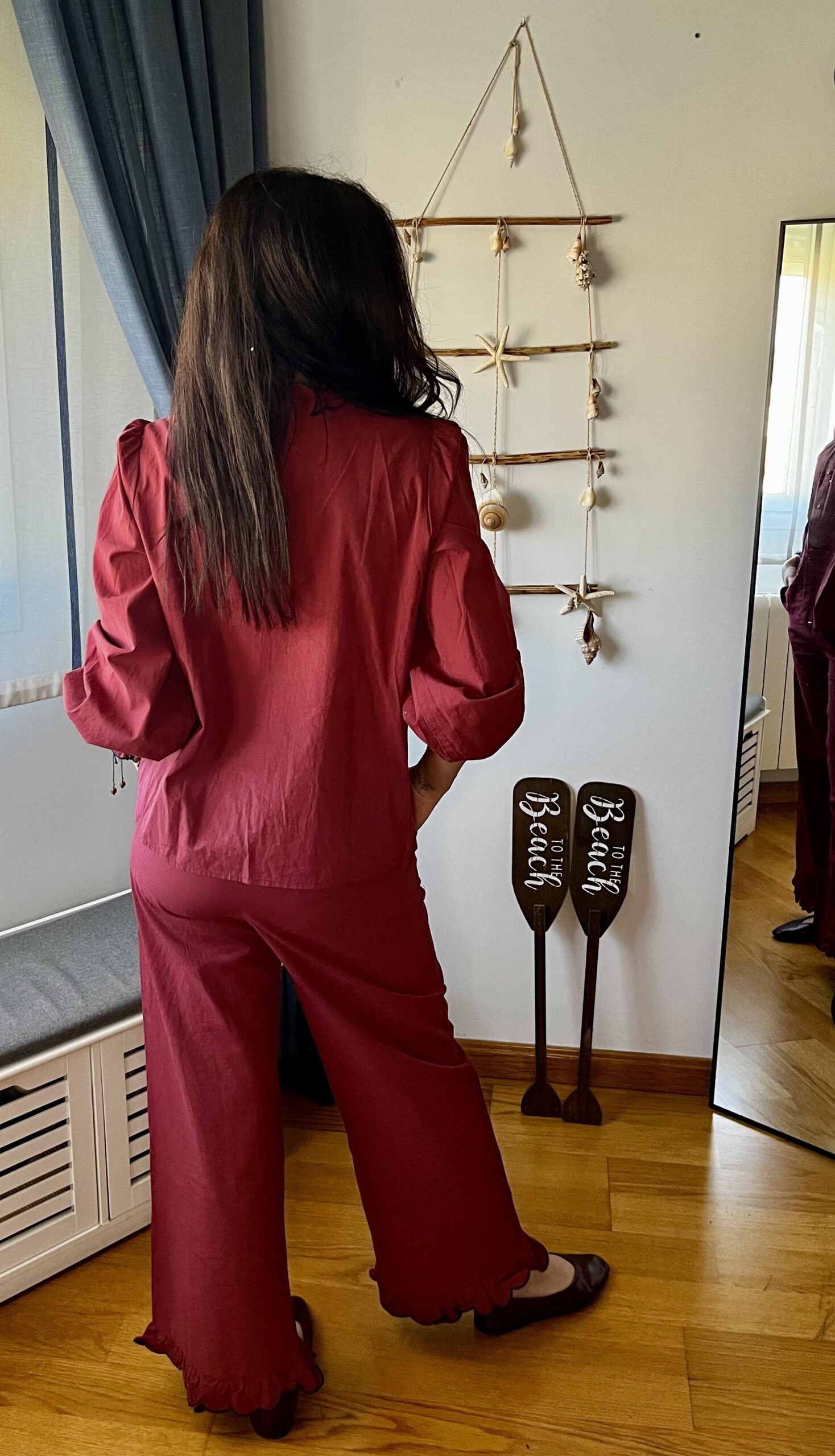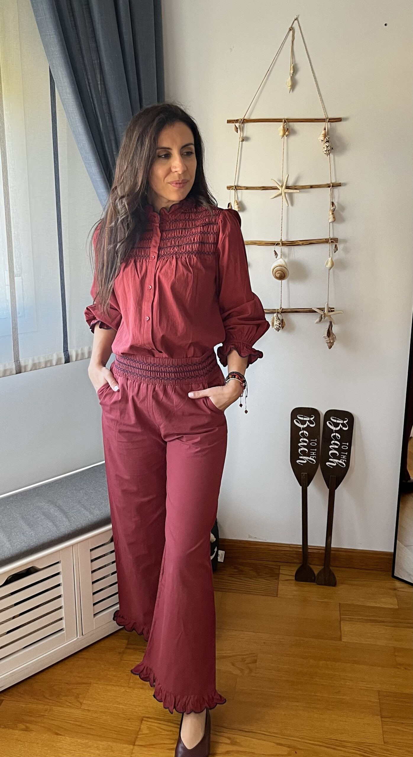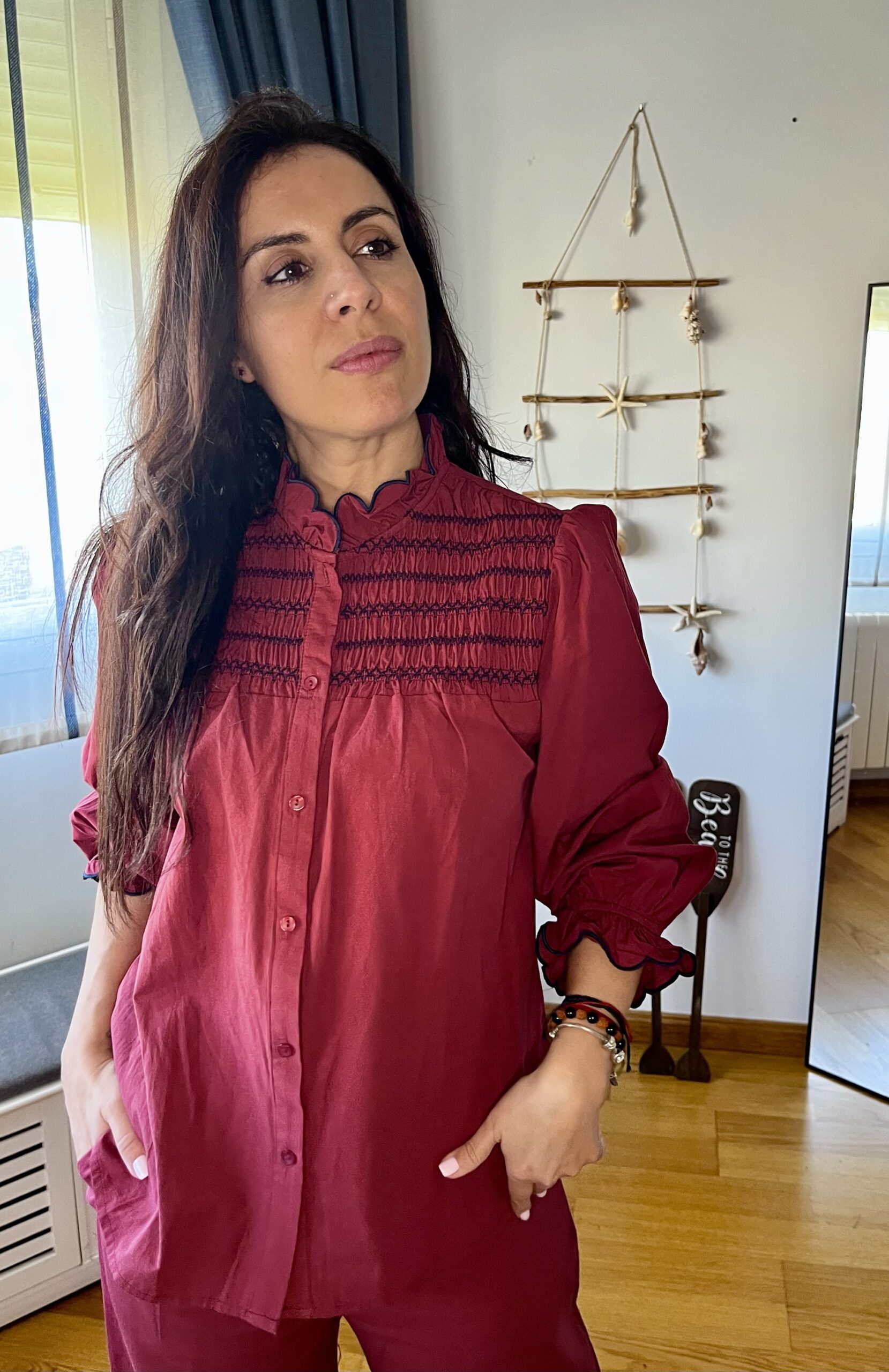 Conjunto Amour burdeos. Camisa nido de abeja con detalles en azul,puños elásticos y cierre por botones. Pantalón con cintura en nido de abeja y detalles en azul, bolsillos laterales y bajo ribeteado.