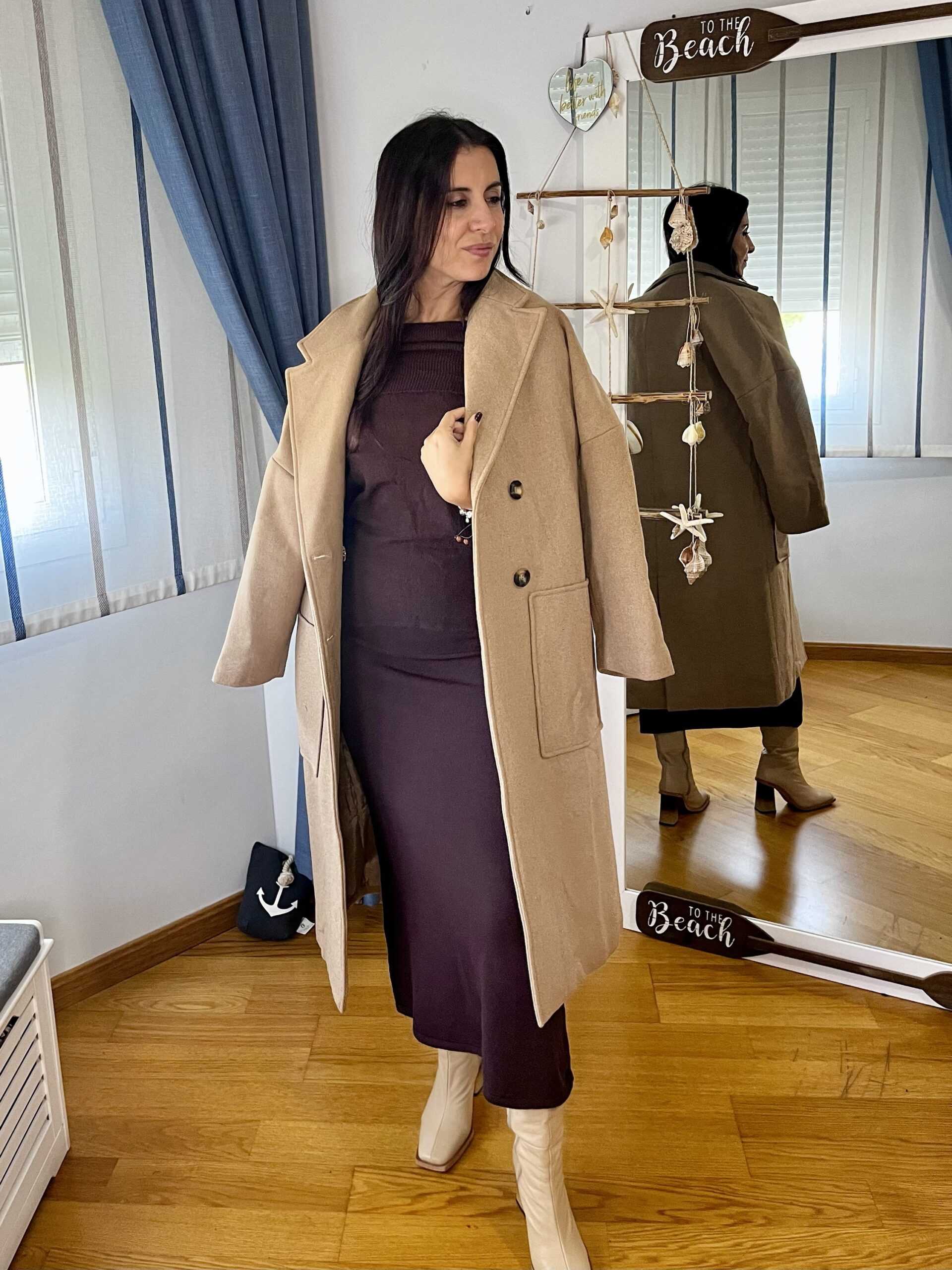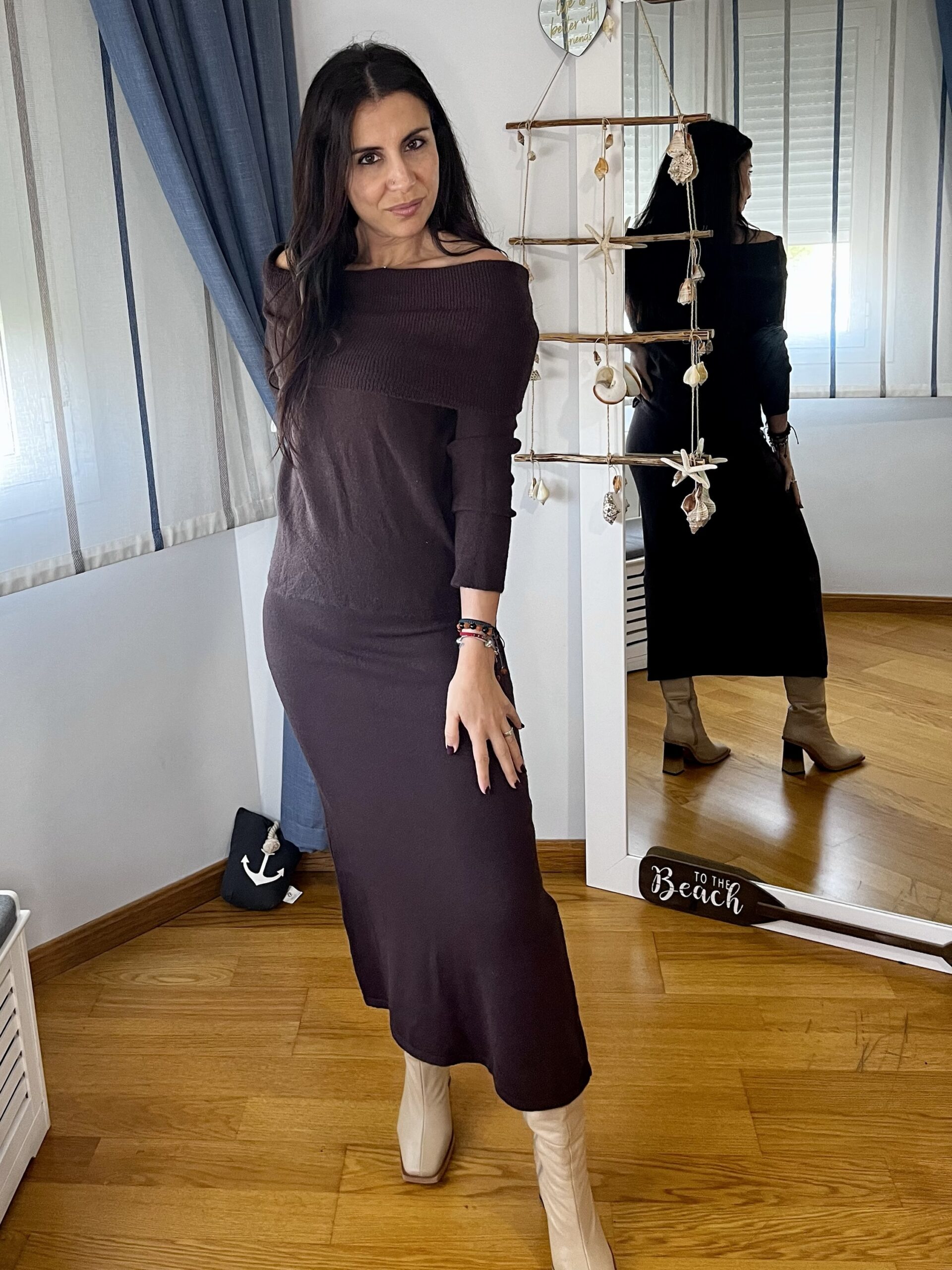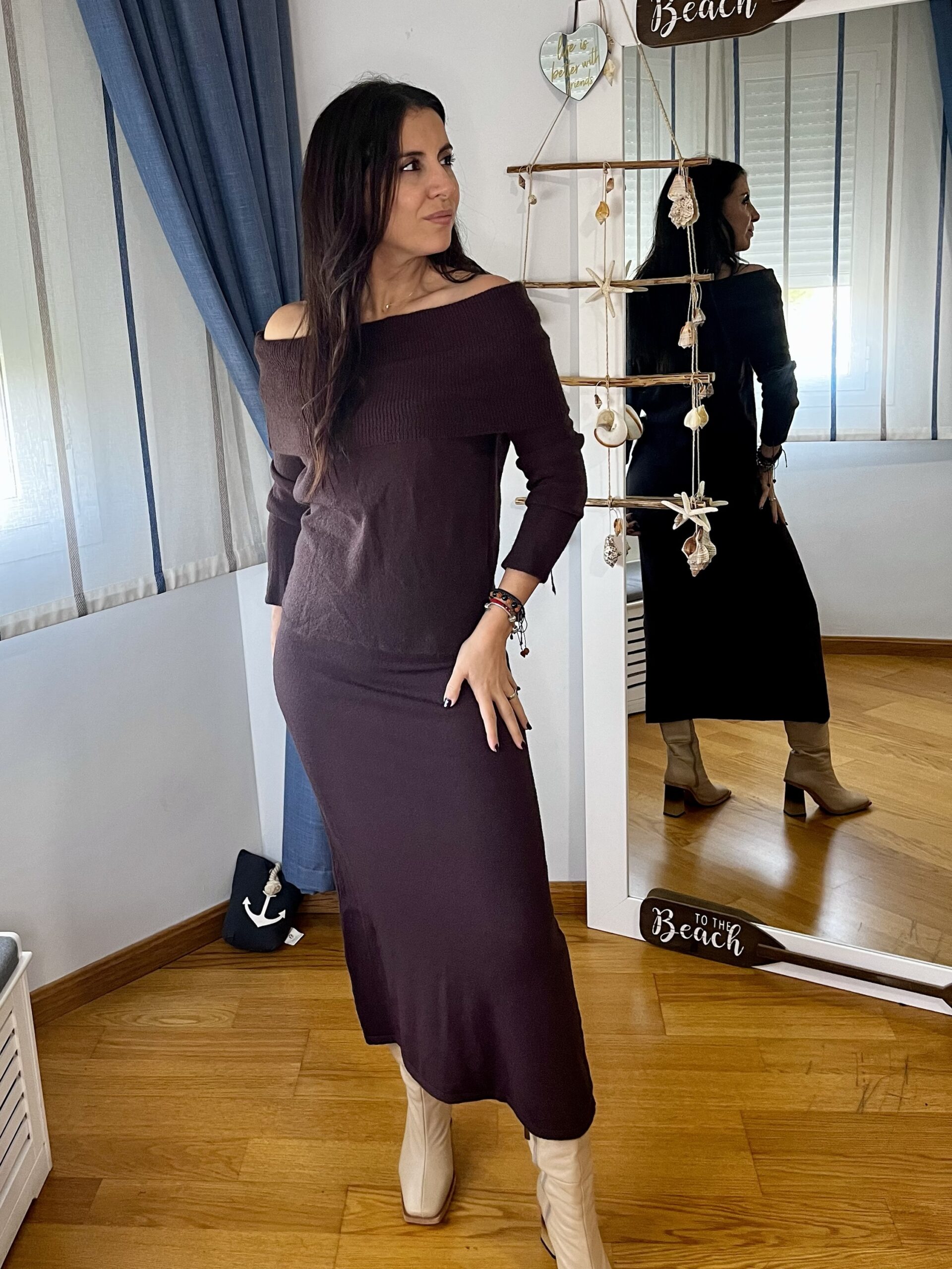 Conjunto de punto color chocolate, compuesto de falda y jersey que podéis combinar por separado. Talla única 34/38