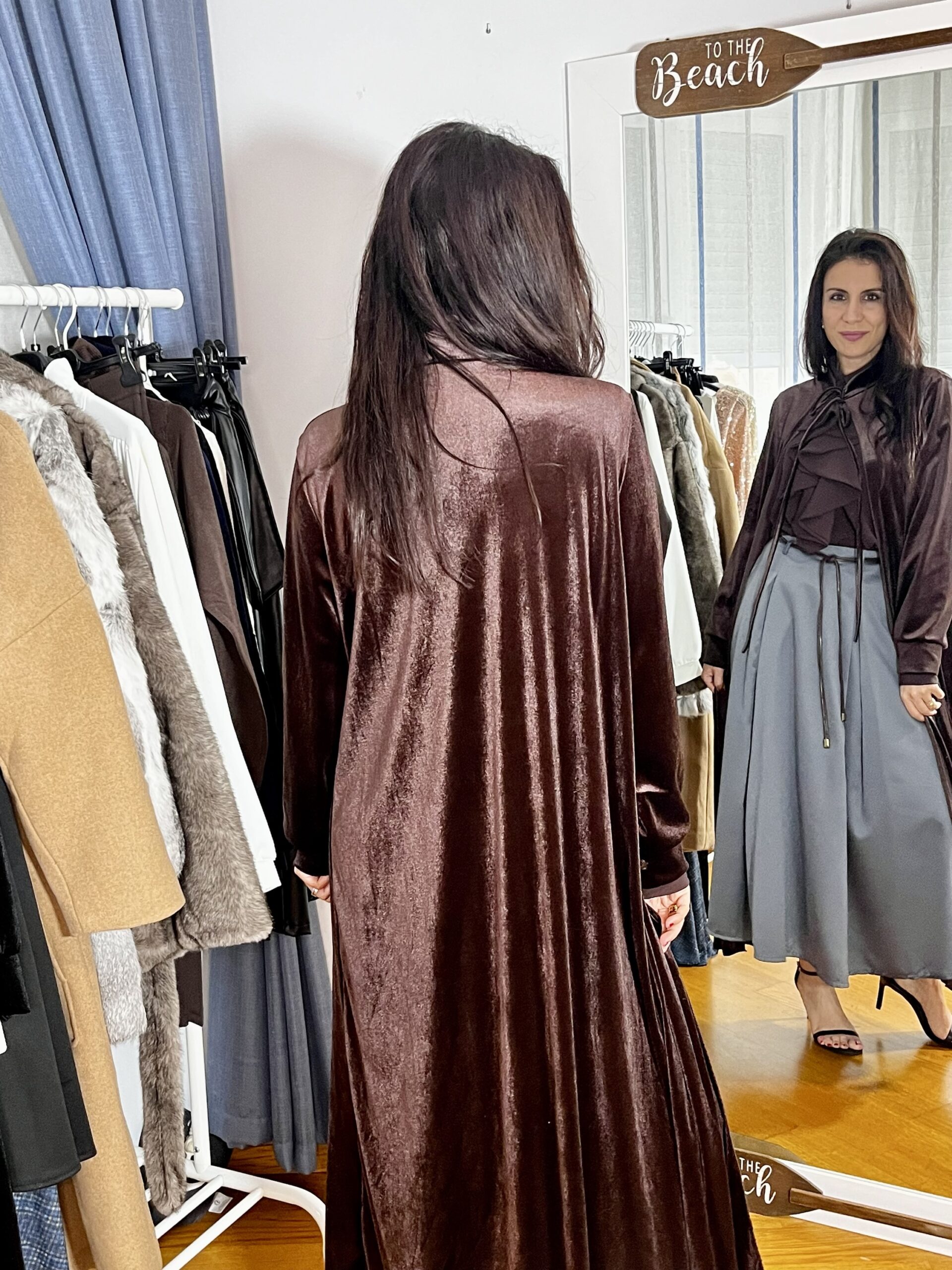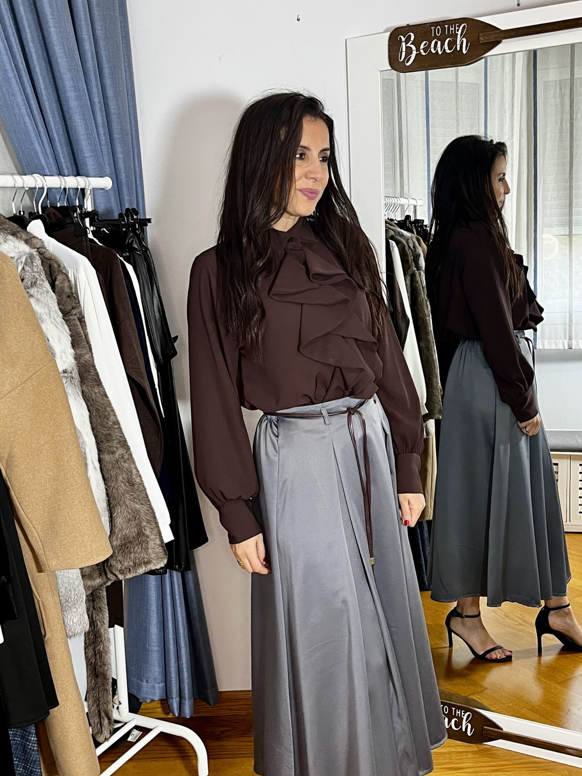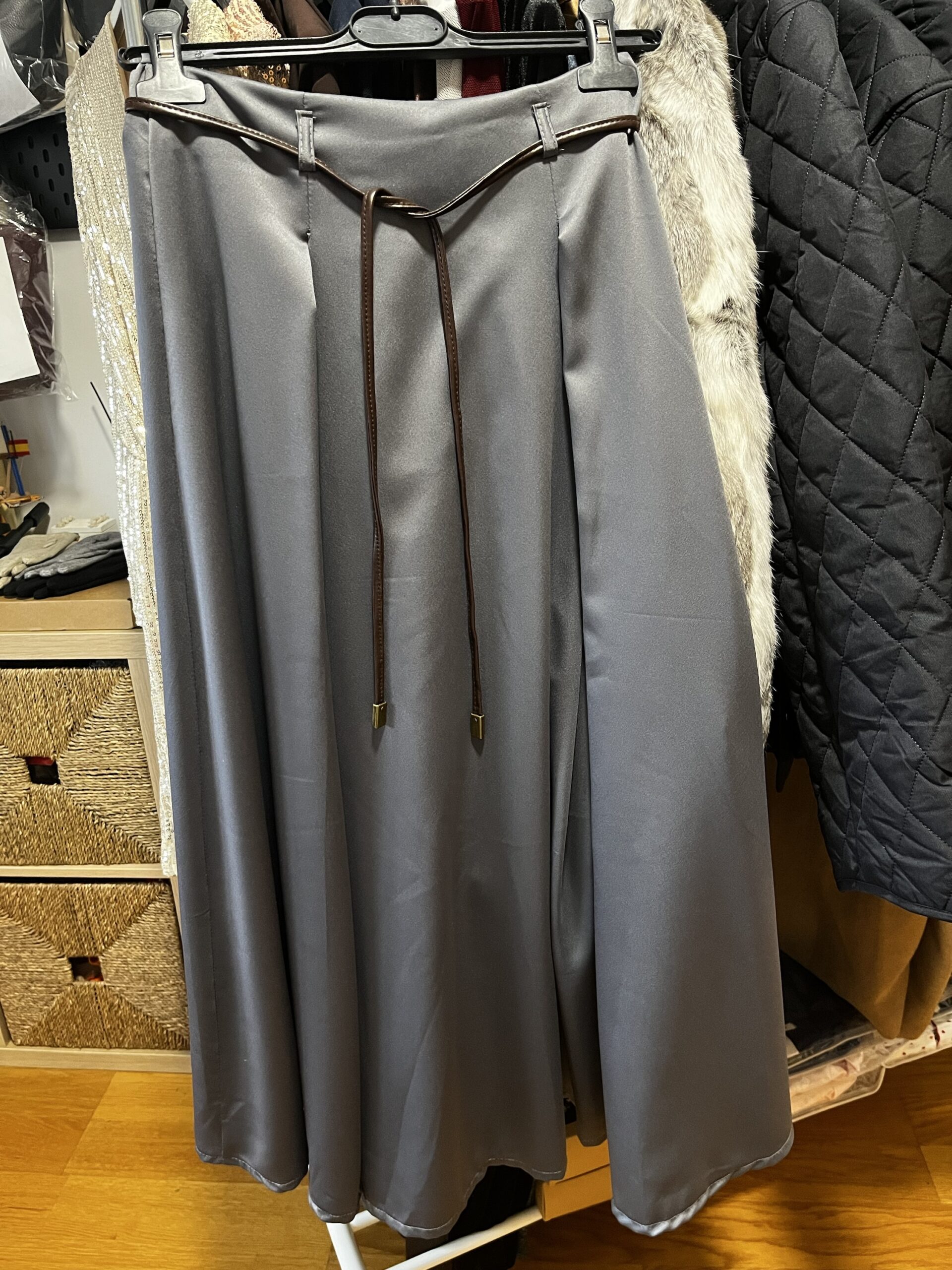 Falda satinada gris de tablas, con cordón marrón, elástico en cintura. Talla única 34/40