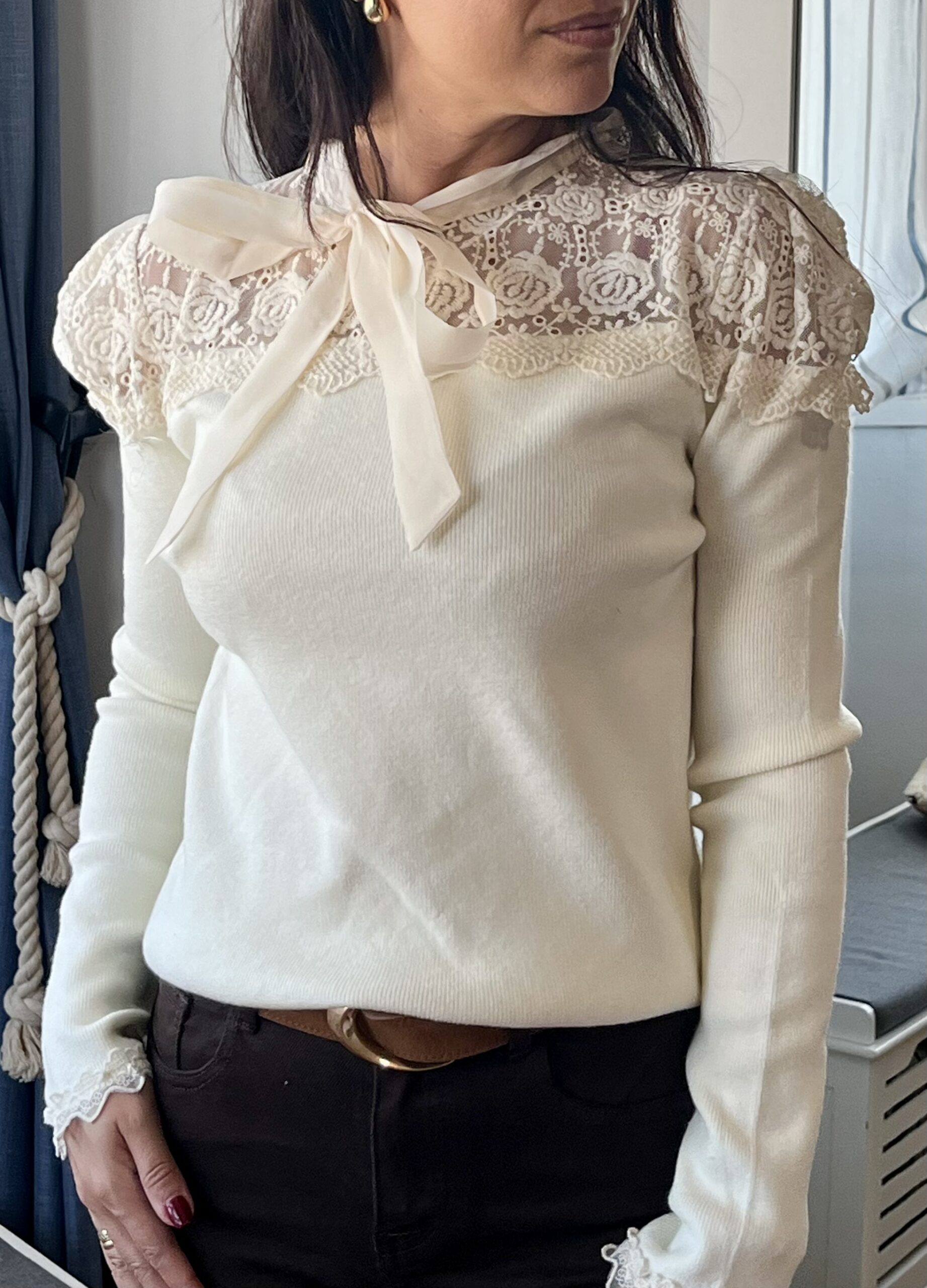 Jersey punto con puntilla en parte superior y puños, y lazada