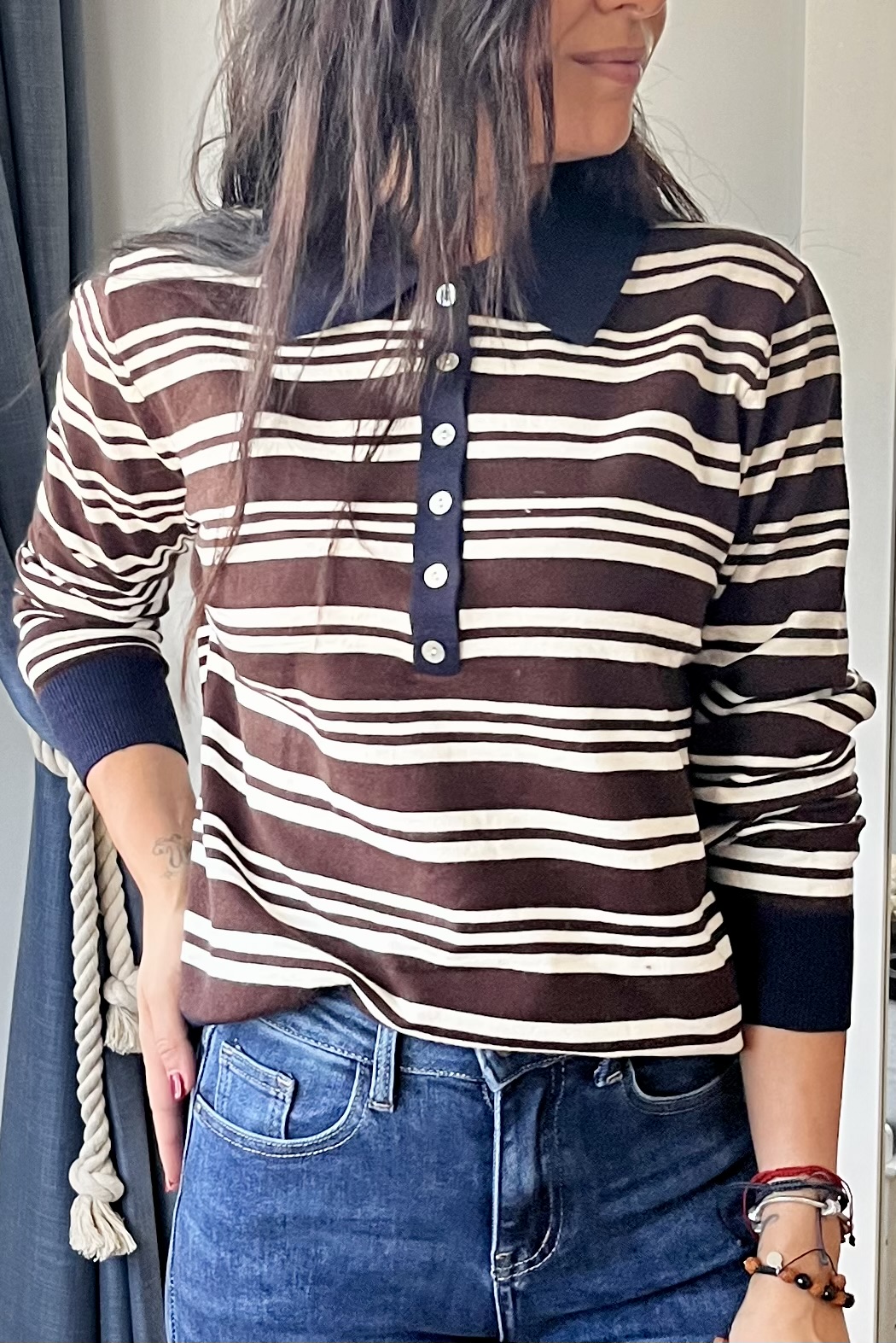 Jersey Elegant chocolate, cuellos y puños en contraste azul marino, cuerpo en rayas marrones y blancas, cuello tipo polo. Talla única que da hasta una 40 máximo.