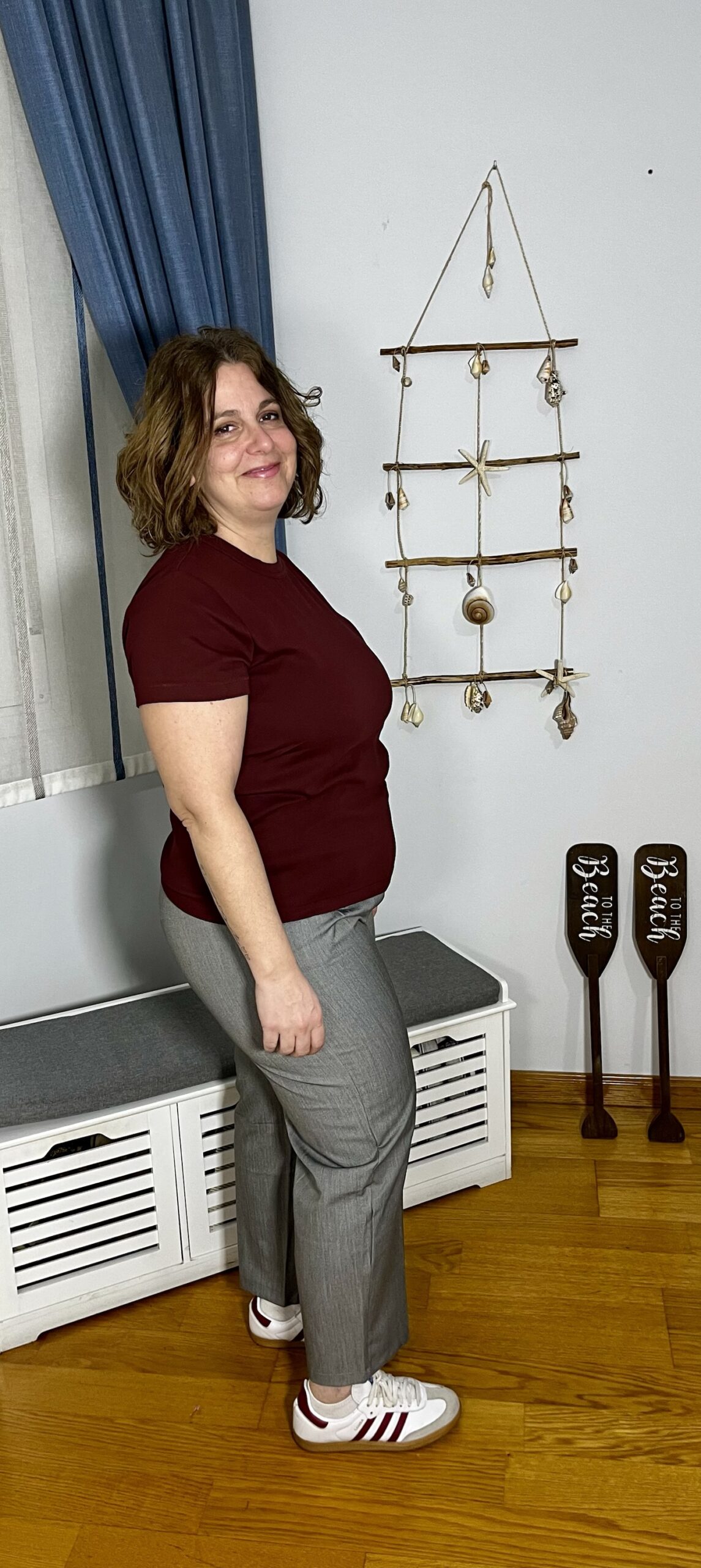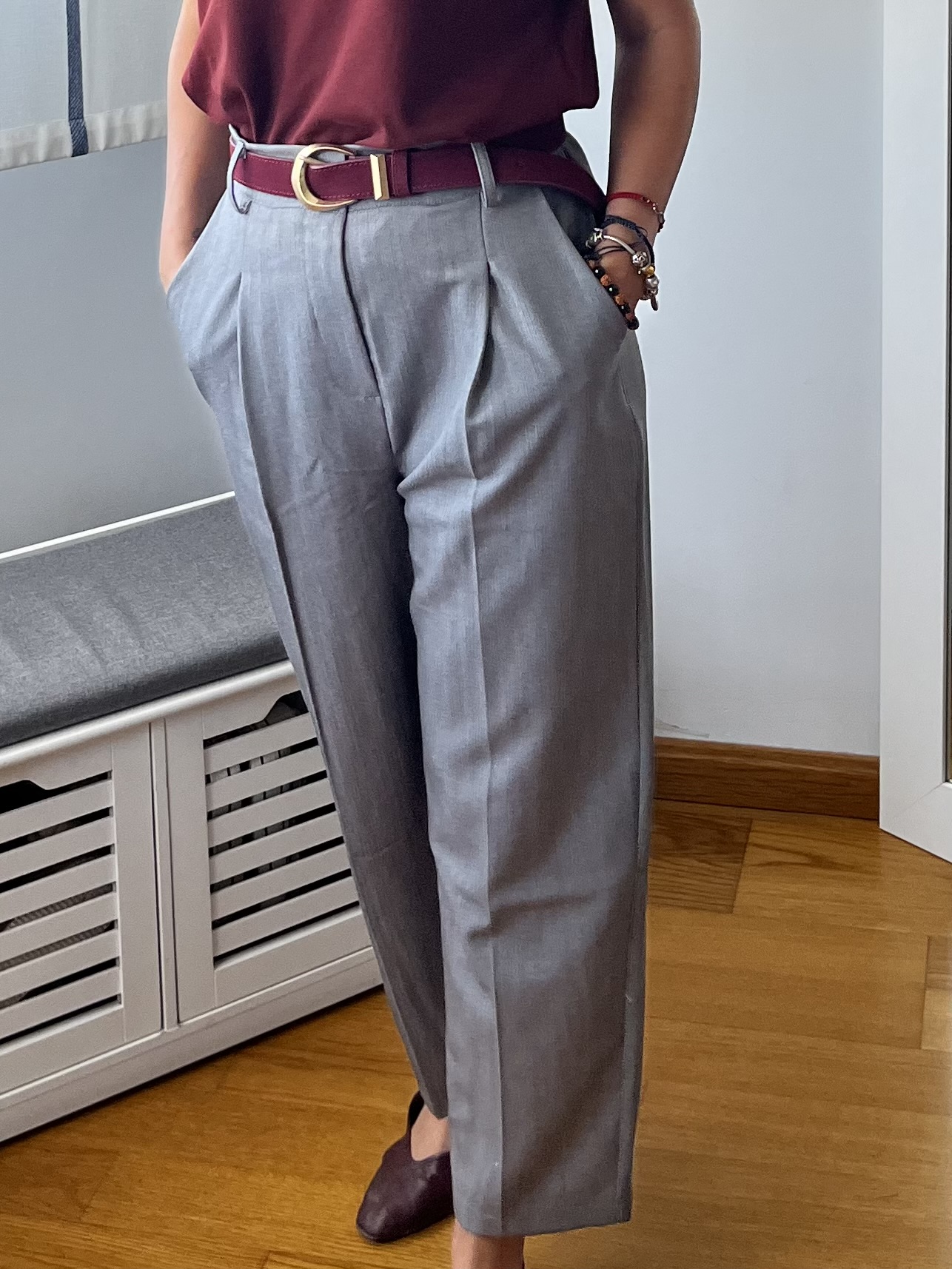 Pantalón tobillero gris, elástico en la cintura, cierre por cremallera y botón,  bolsillos laterales.