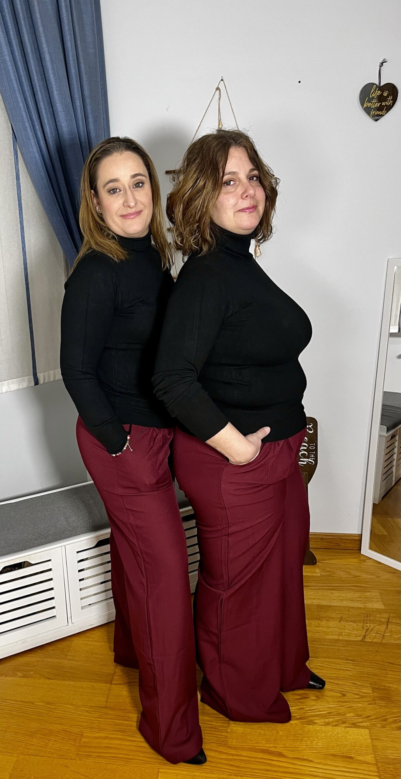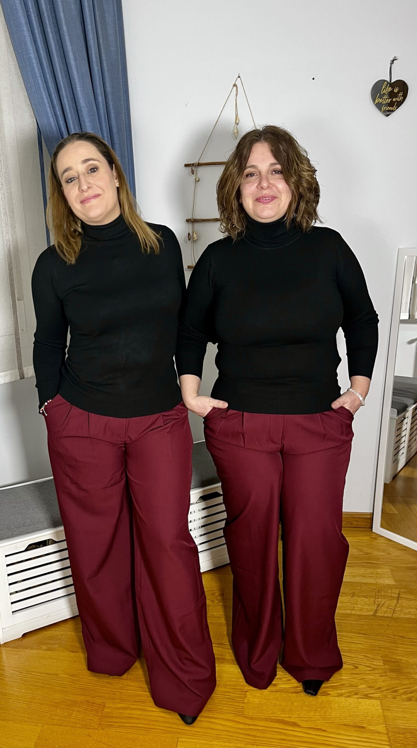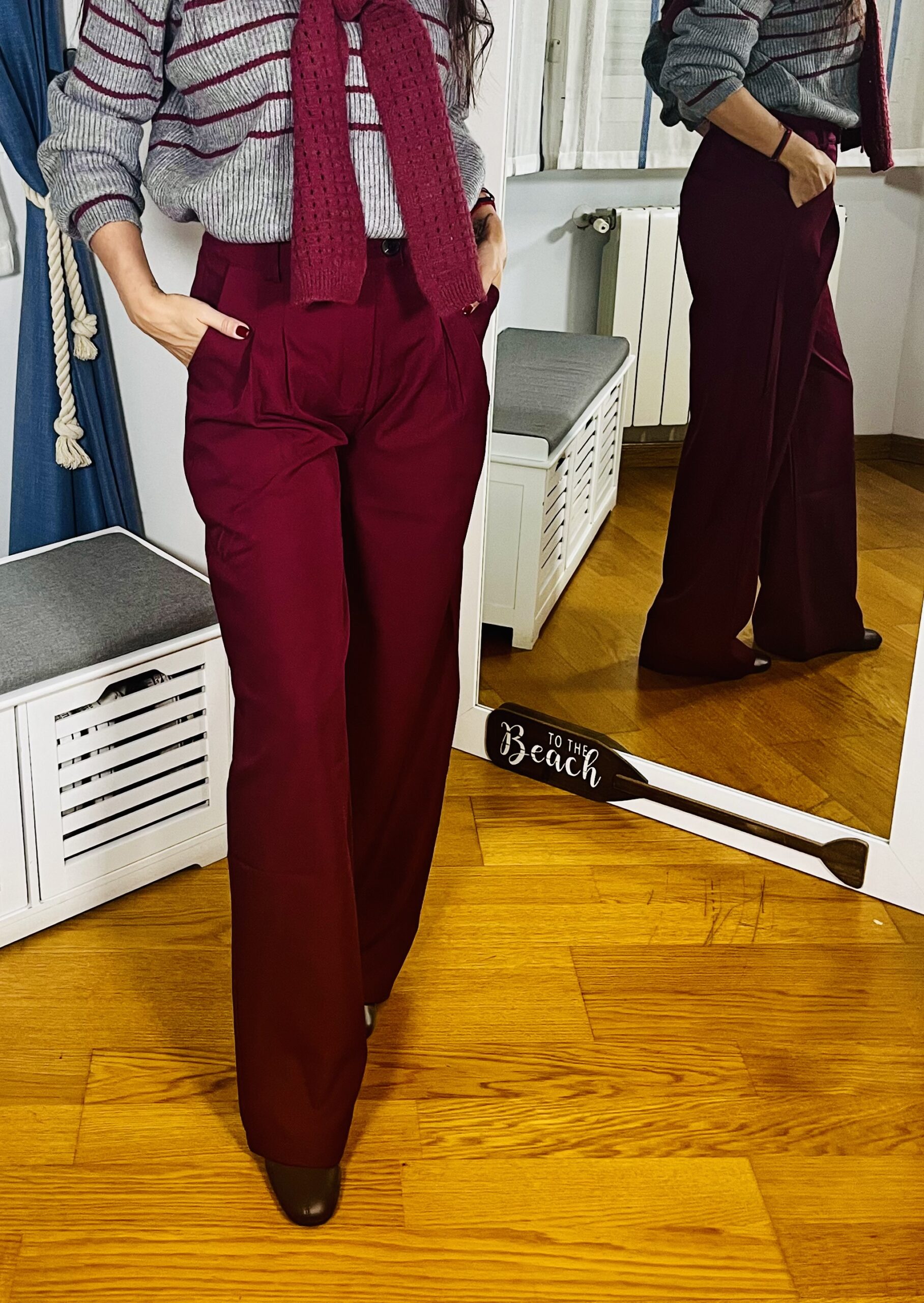 Pantalón pinzas Elegance burdeos, bosillos laterales, cierre por botón y cremallera, elástico en la parte trasera.