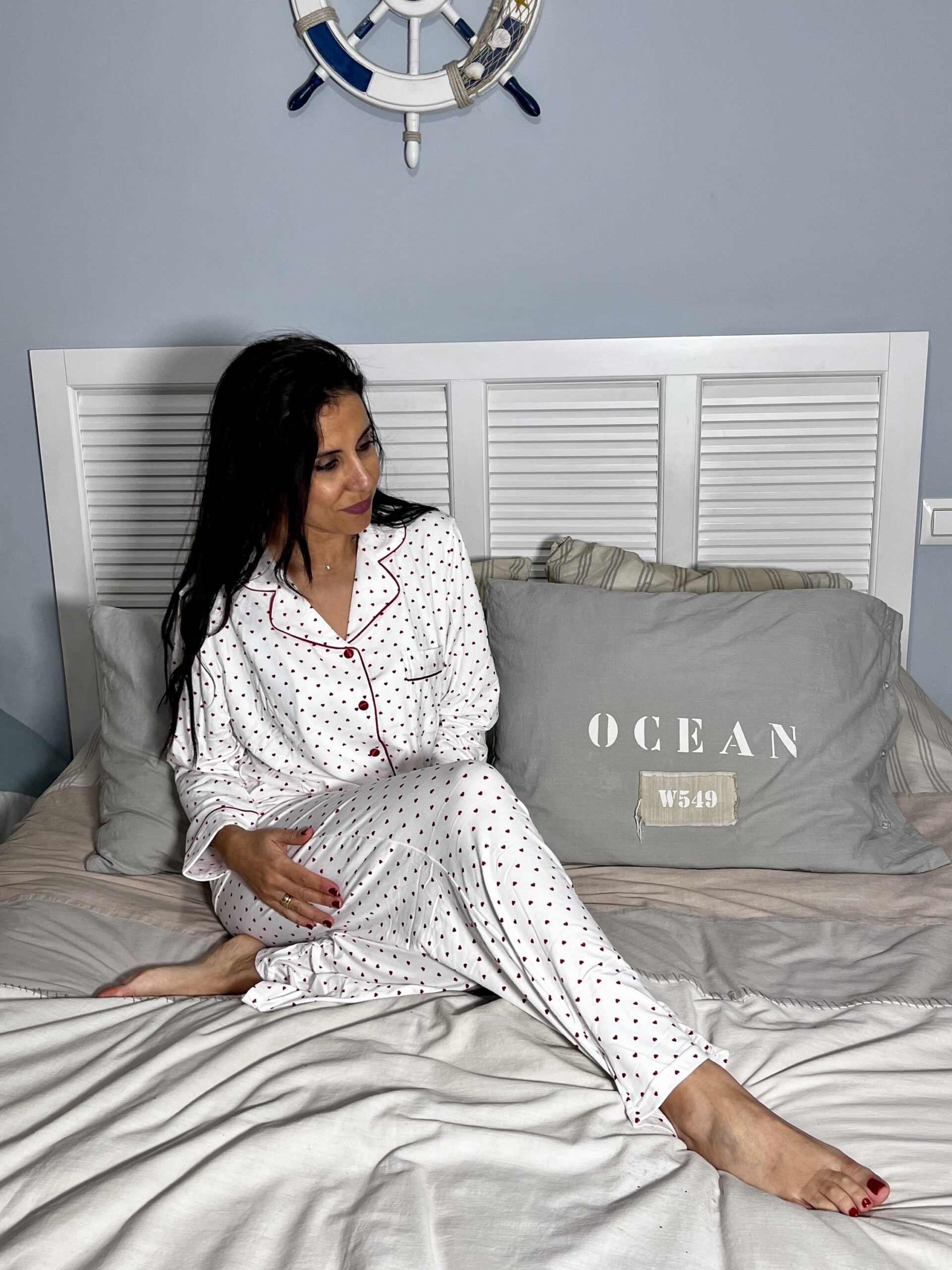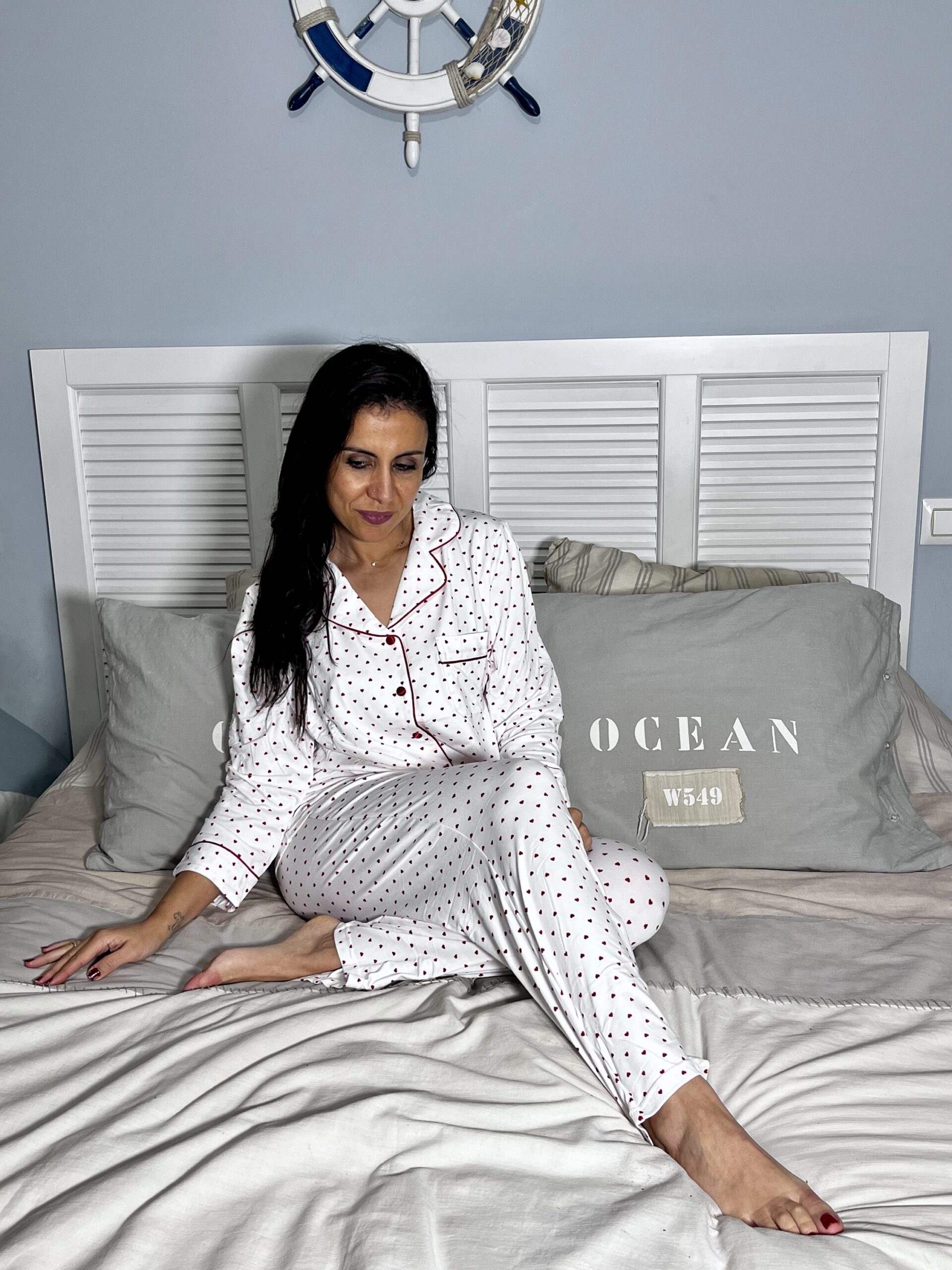Pijama corazones,cierre por botón,cintura elástica y cordón ajustables,interior de pelo,contraste raso rojo.