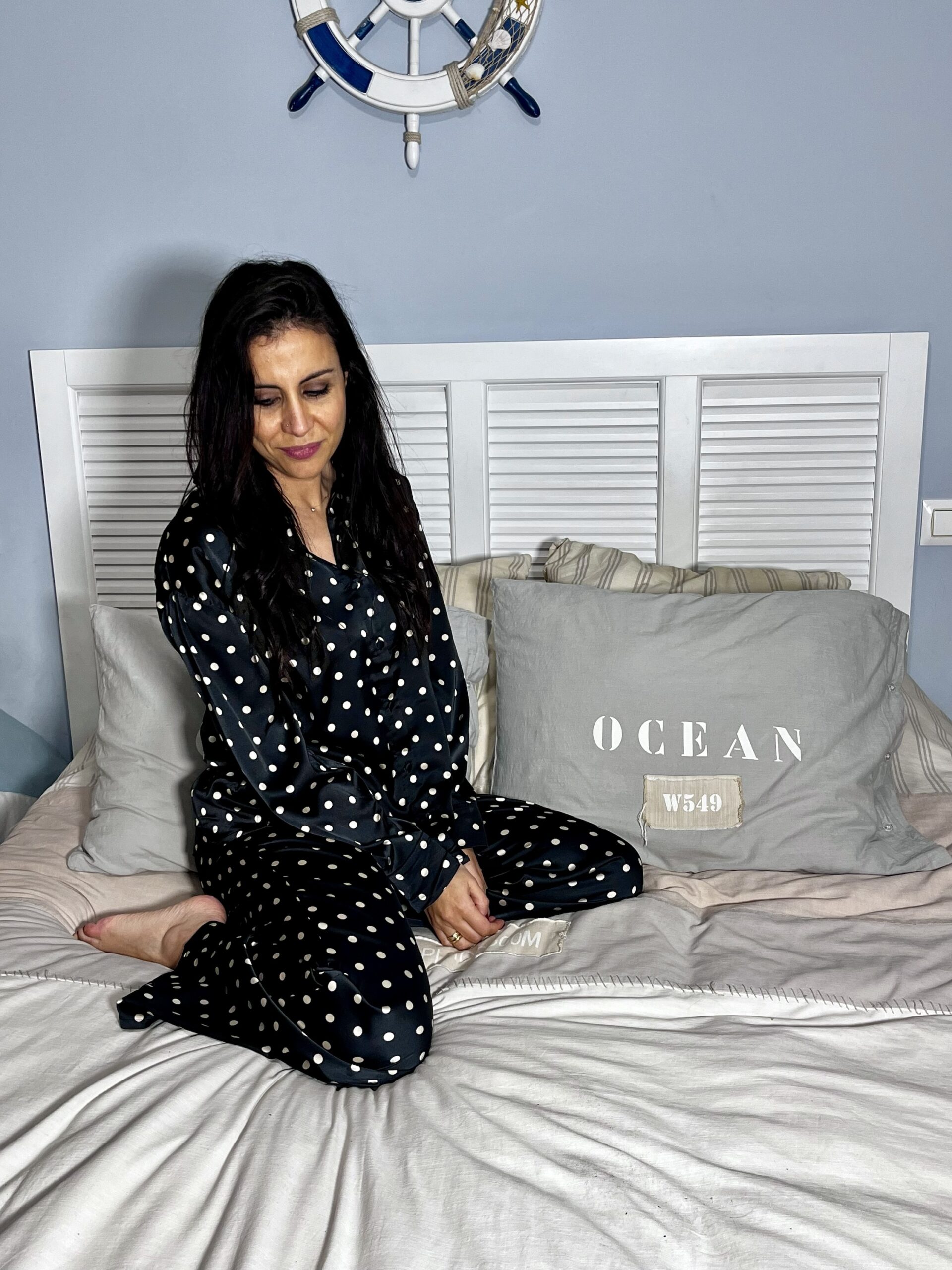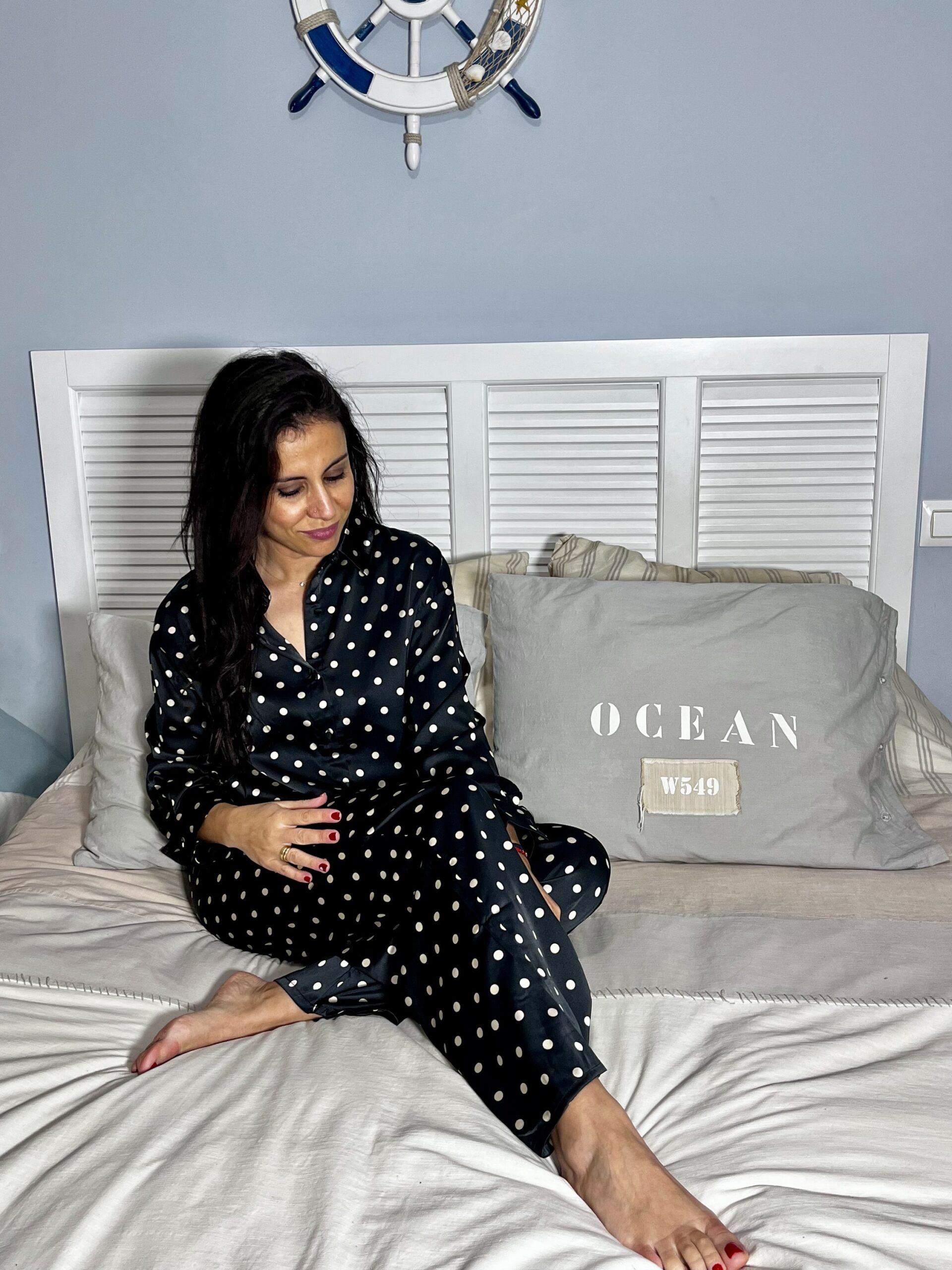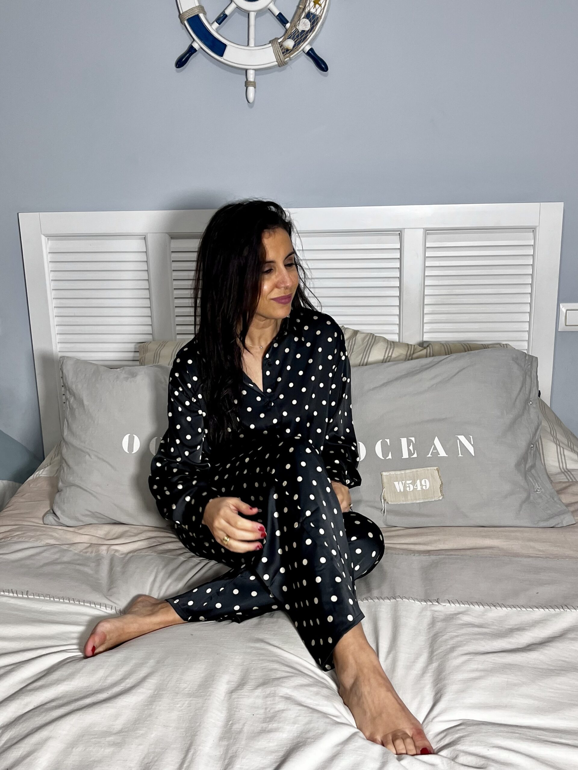 Pijama satinado topos, cierre por botones en parte delantera,cintura elástica y cordón ajustable,bolsillos laterales.