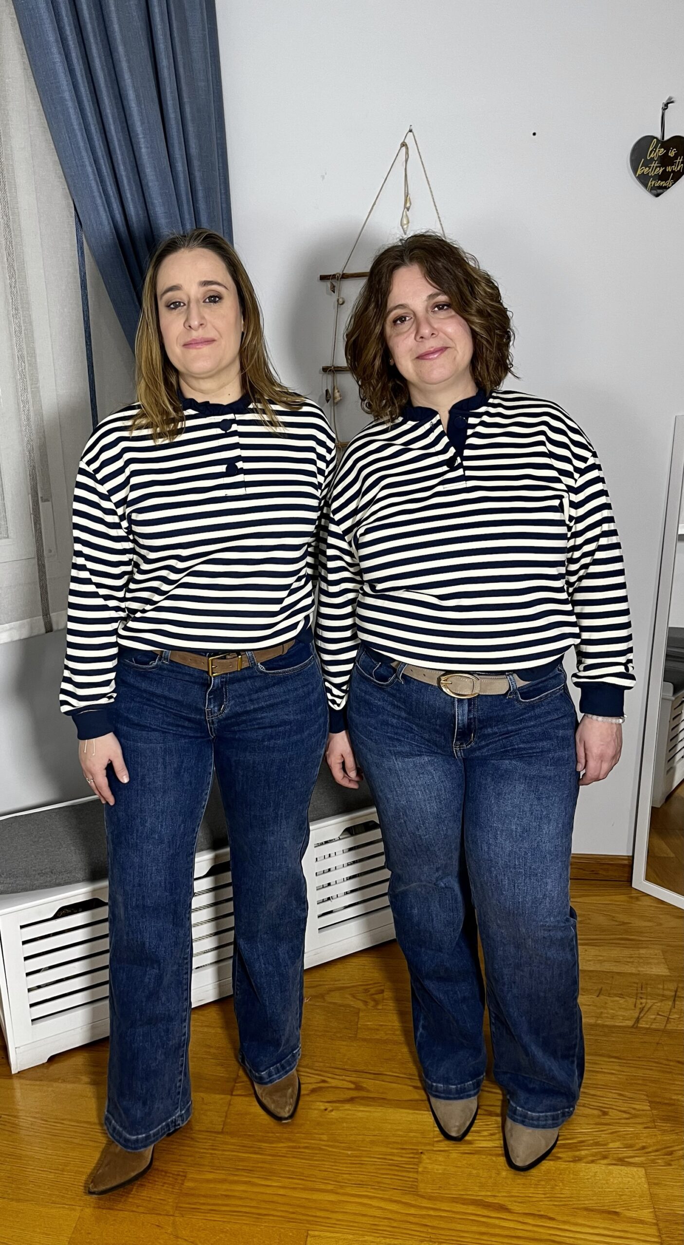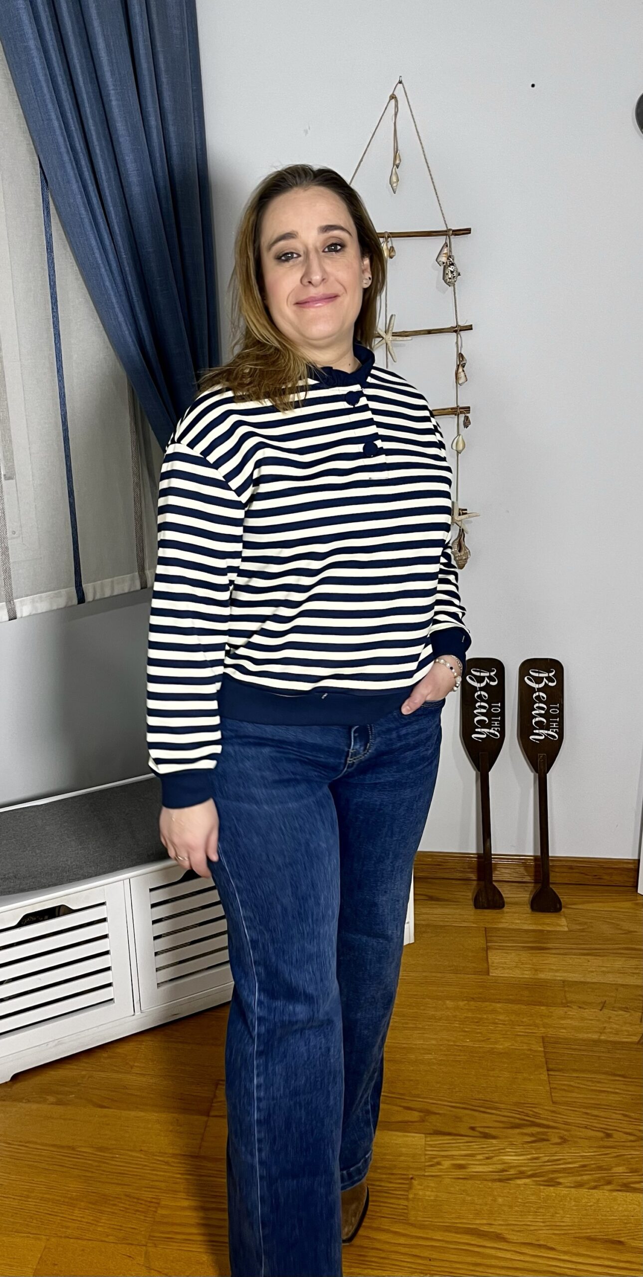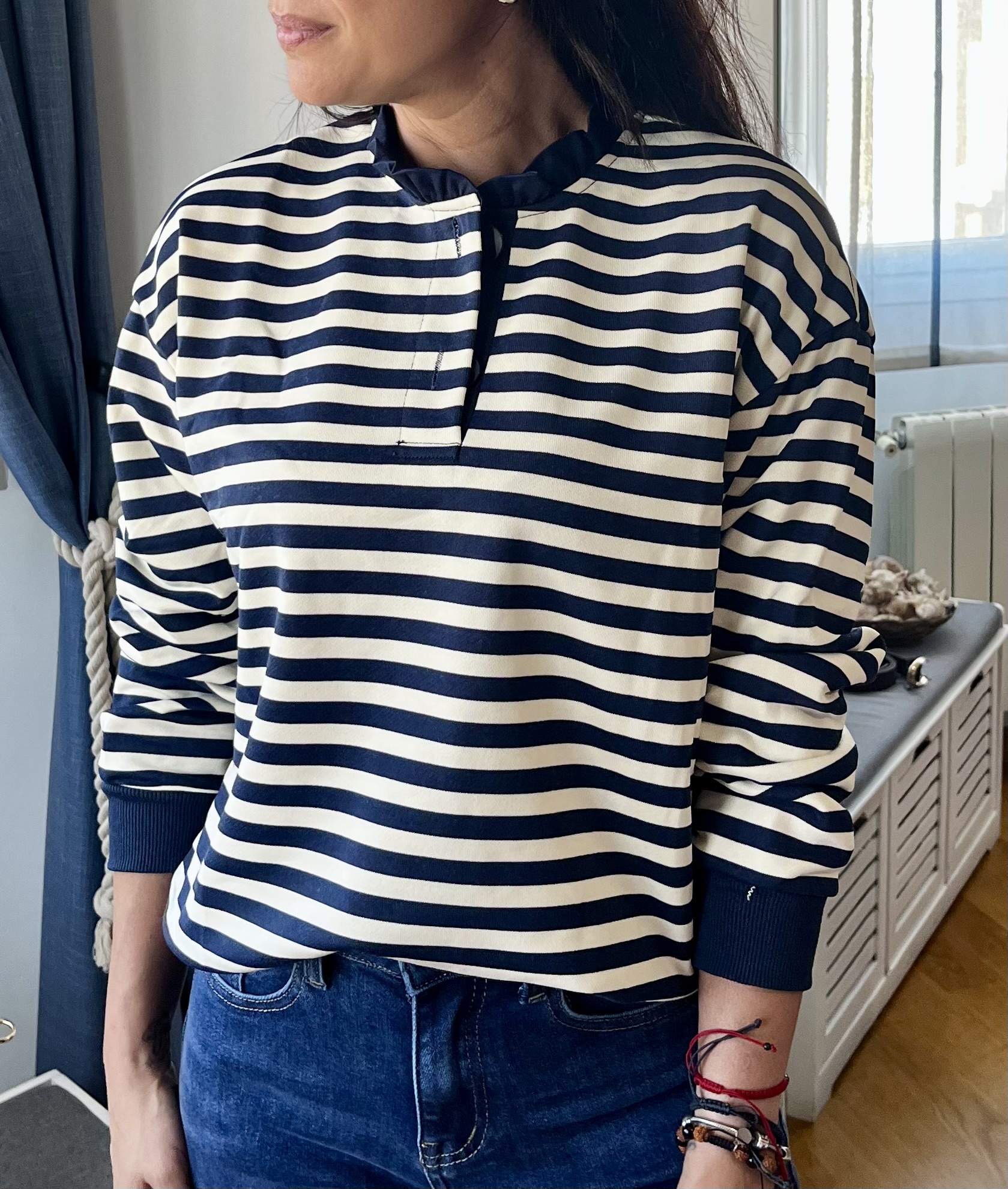 Sudadera azul marino de rayas, cuello ribeteado azul y cierre por botones