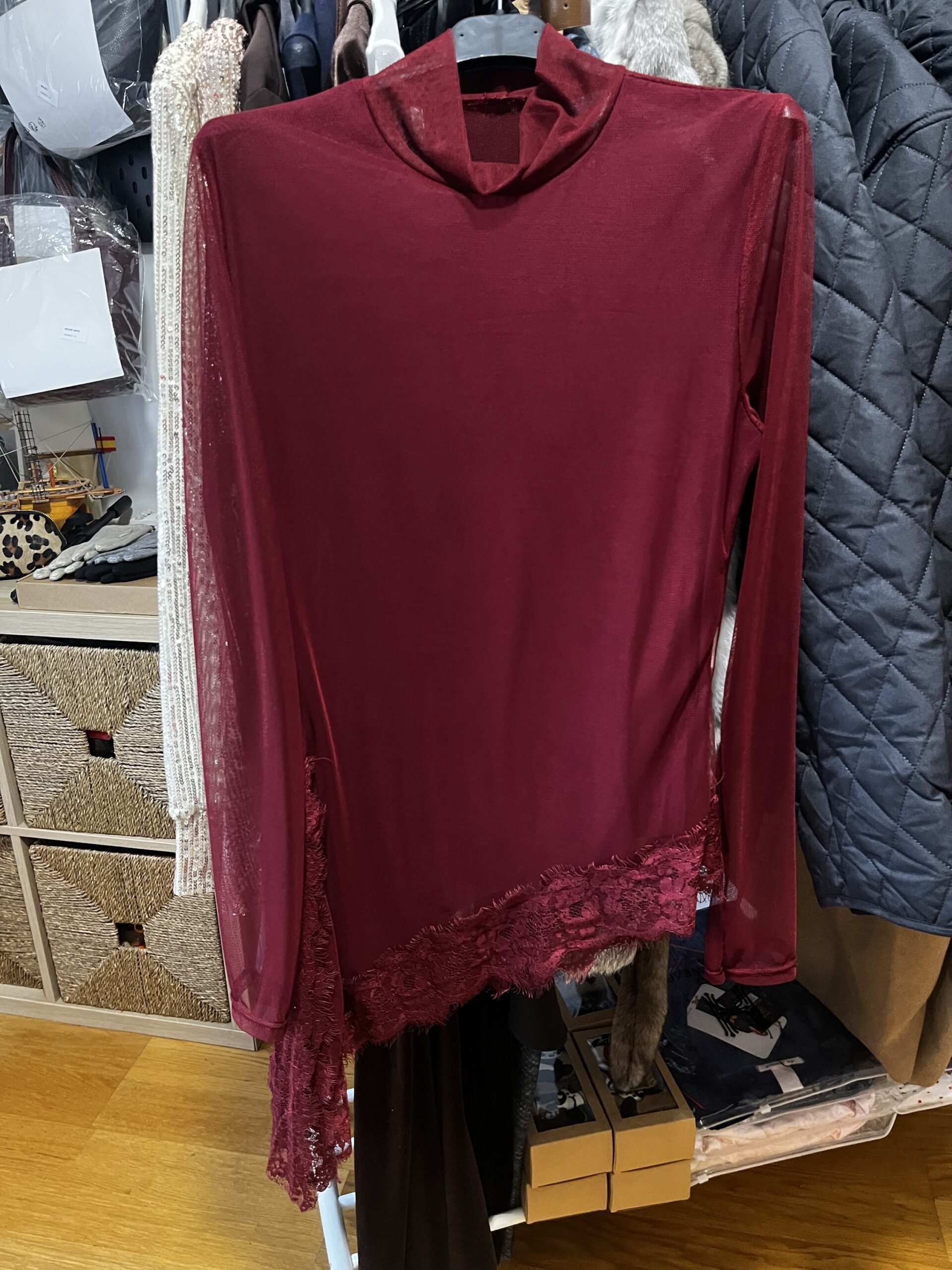 Top encaje burdeos asimétrico, mangas caladas, forro parte delantera, cuello cisne. Talla única 34/40