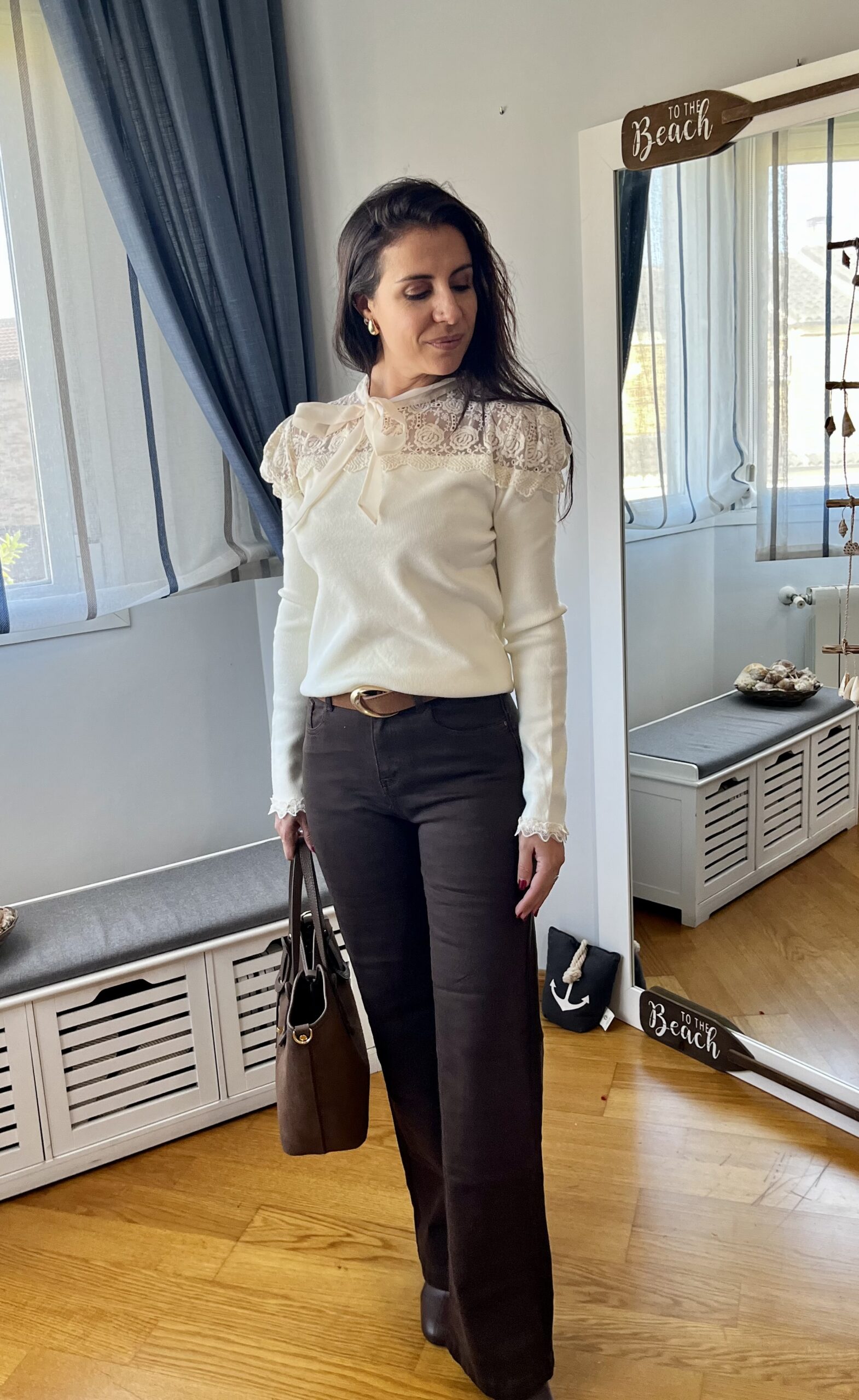 Vaquero Boston color chocolate, tiro alto, pierna ancha,cierre con botón y cremallera delantera, cintura elástica, es elástico, bolsillos delanteros y traseros.